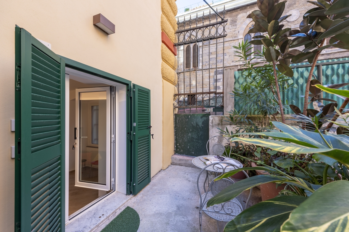 Outside, you'll find a small patio area with a table and chairs, ideal for enjoying a morning coffee or evening glass of wine in the fresh air.