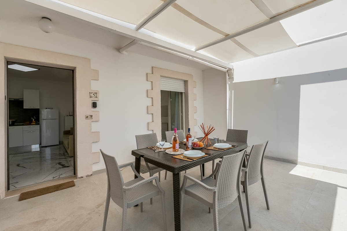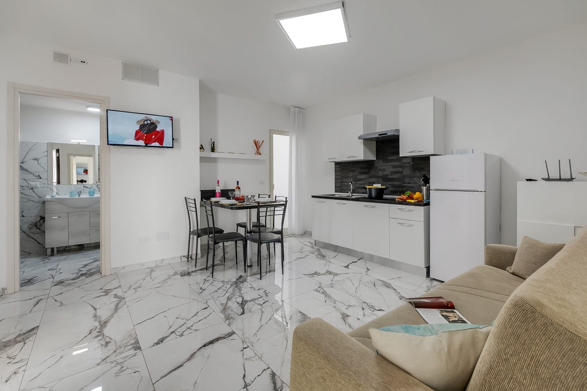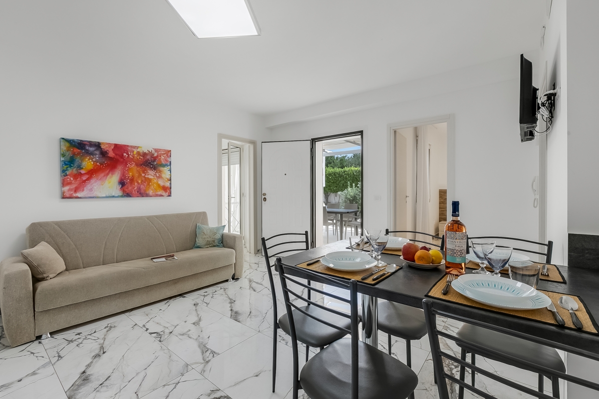 This ground-floor apartment leads off the terrace at the centre of Pino Residence, an attractive resort just a 20-minute walk from the stunning Torre Lapillo beach. Pino 5 apartment can sleep 6 people and makes the ideal holiday base for friends or family who want to relax and explore the beautiful Salento Peninsula. As part of a modern residence, guests can enjoy a large shared swimming pool with an on-site restaurant and bar.
