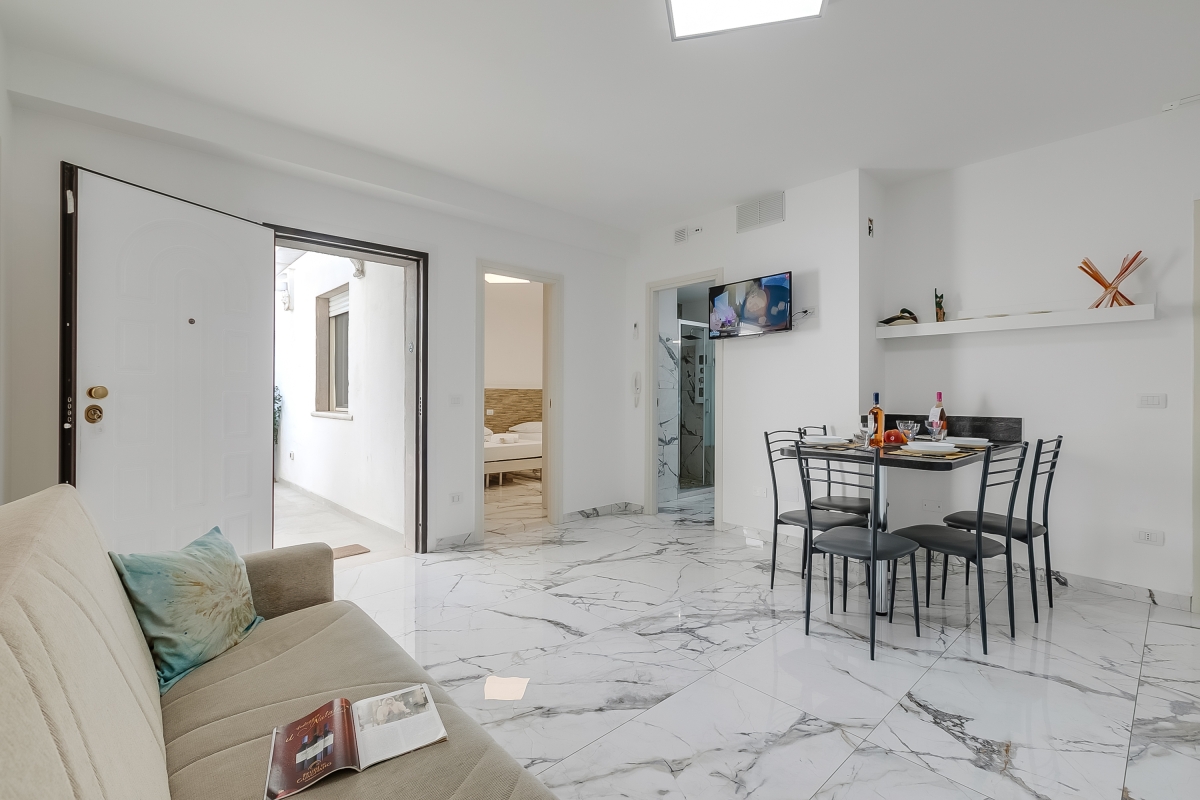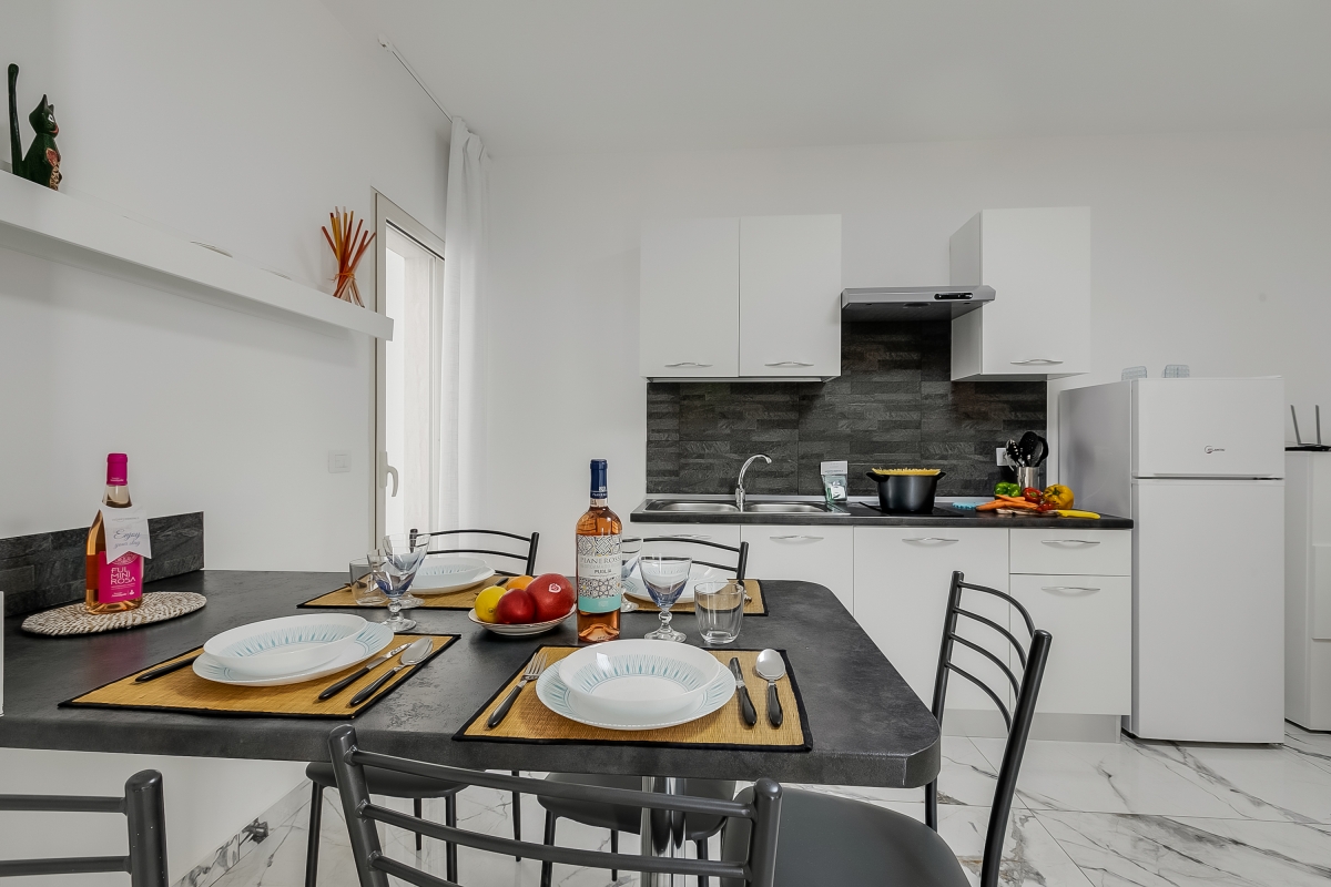 At the front of the apartment, guests will find an attractive private courtyard, furnished with a dining table and chairs, for memorable meals al fresco. The front door from the courtyard opens into an open-plan kitchen/dining/seating area. This is furnished with a sofa, flat-screen TV, dining table and new, fitted kitchenette. The kitchenette is equipped with an induction hob, fridge/freezer and a Mokka coffee machine.