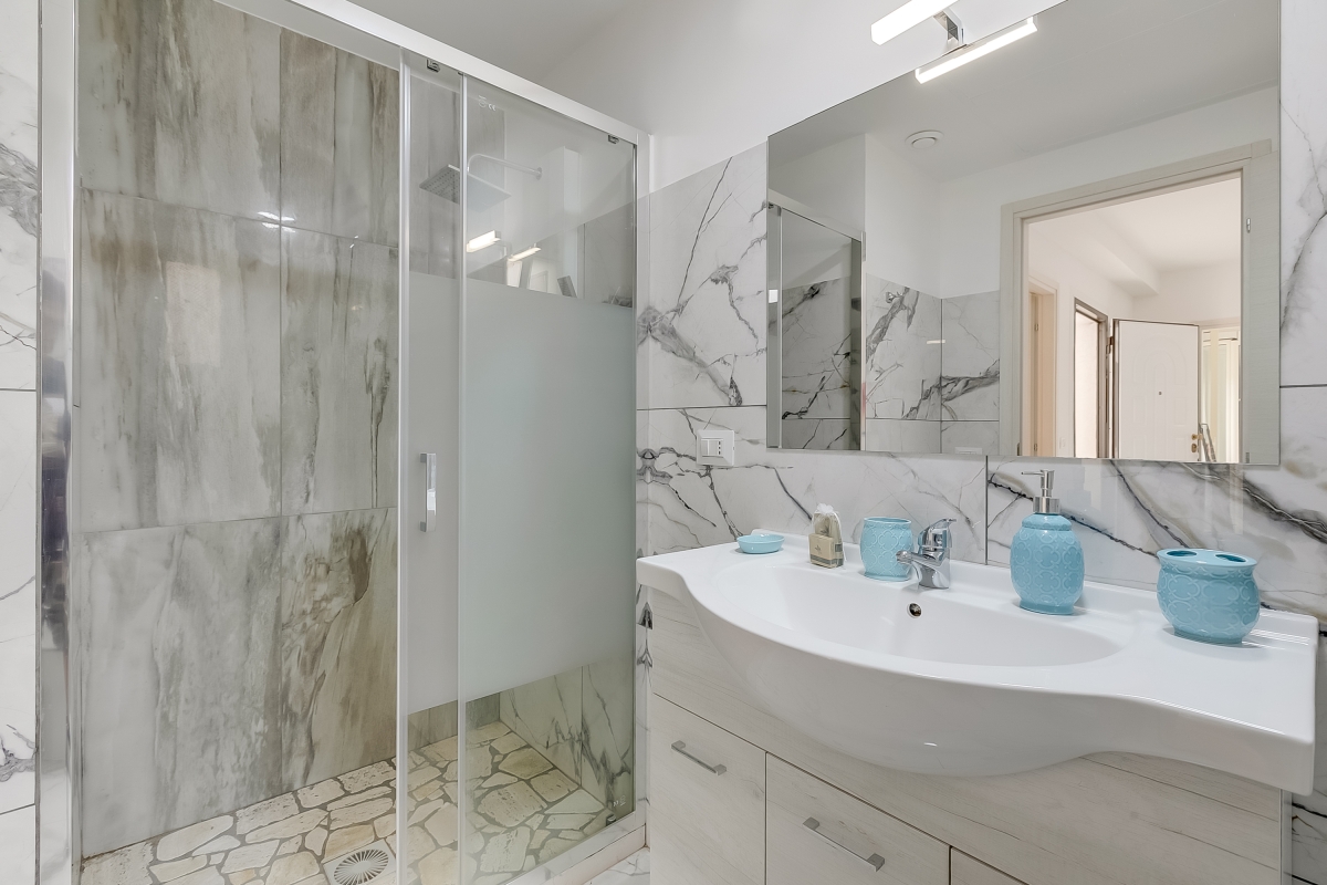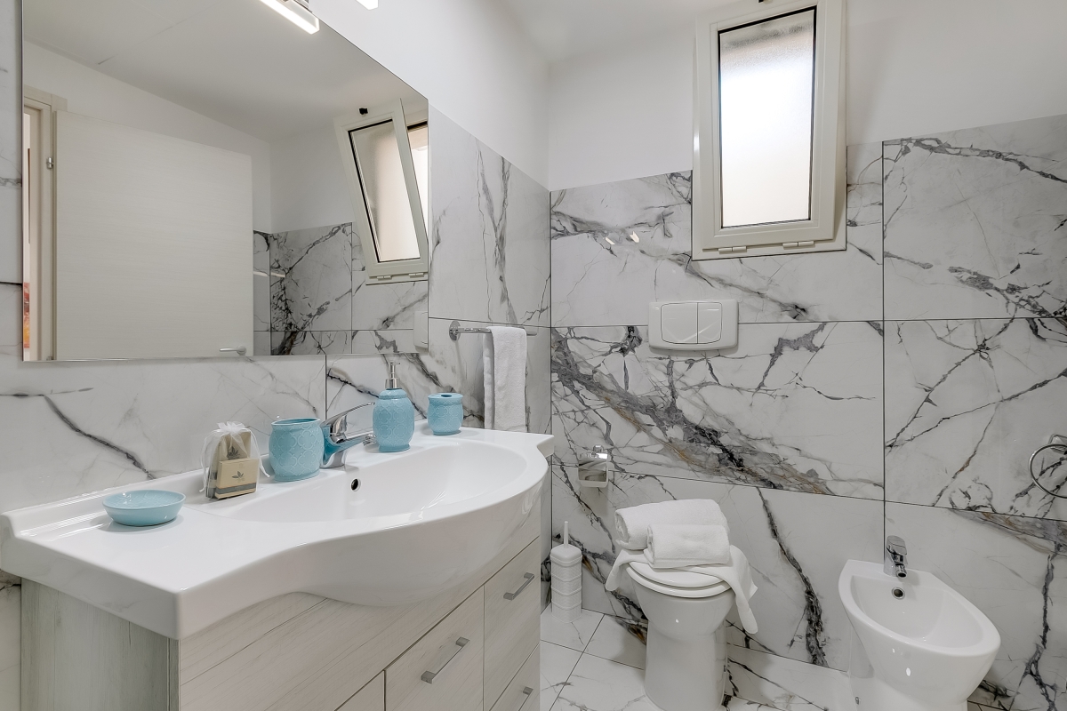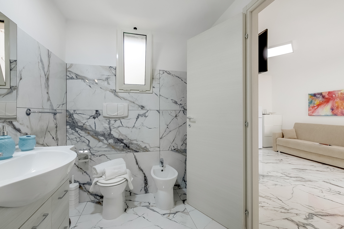 The marble bathroom has a hydro-massage shower, basin, bidet and WC