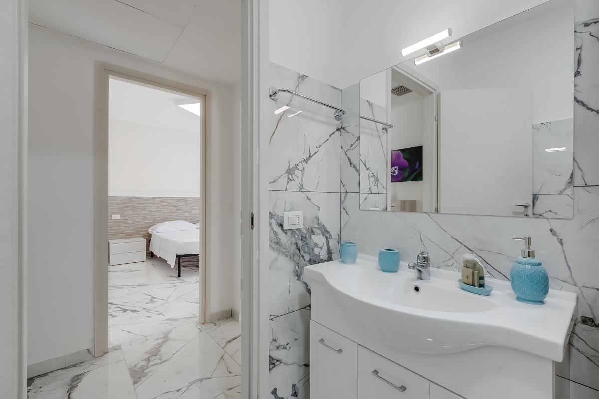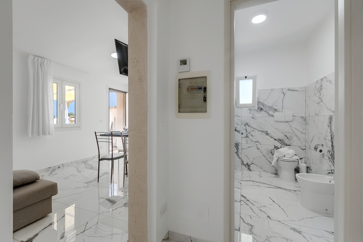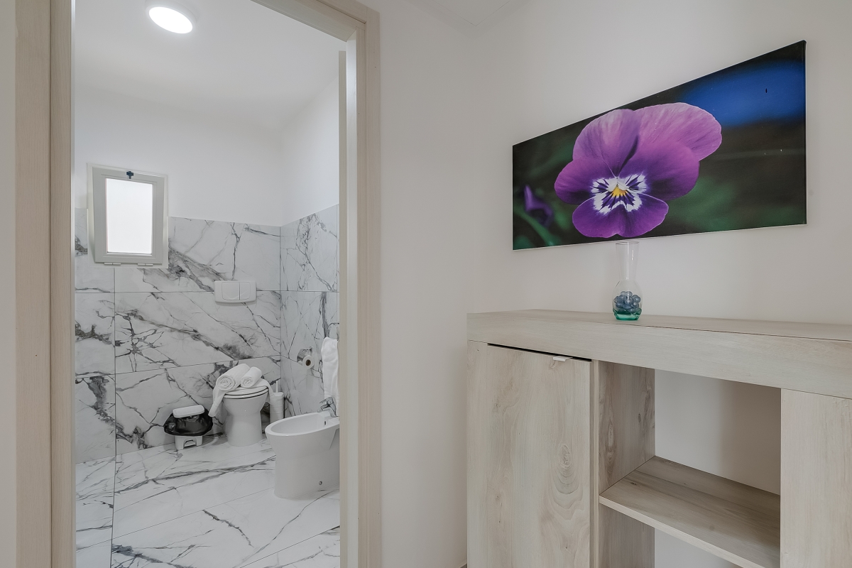 The marble bathroom has a hydro-massage shower, basin, bidet and WC