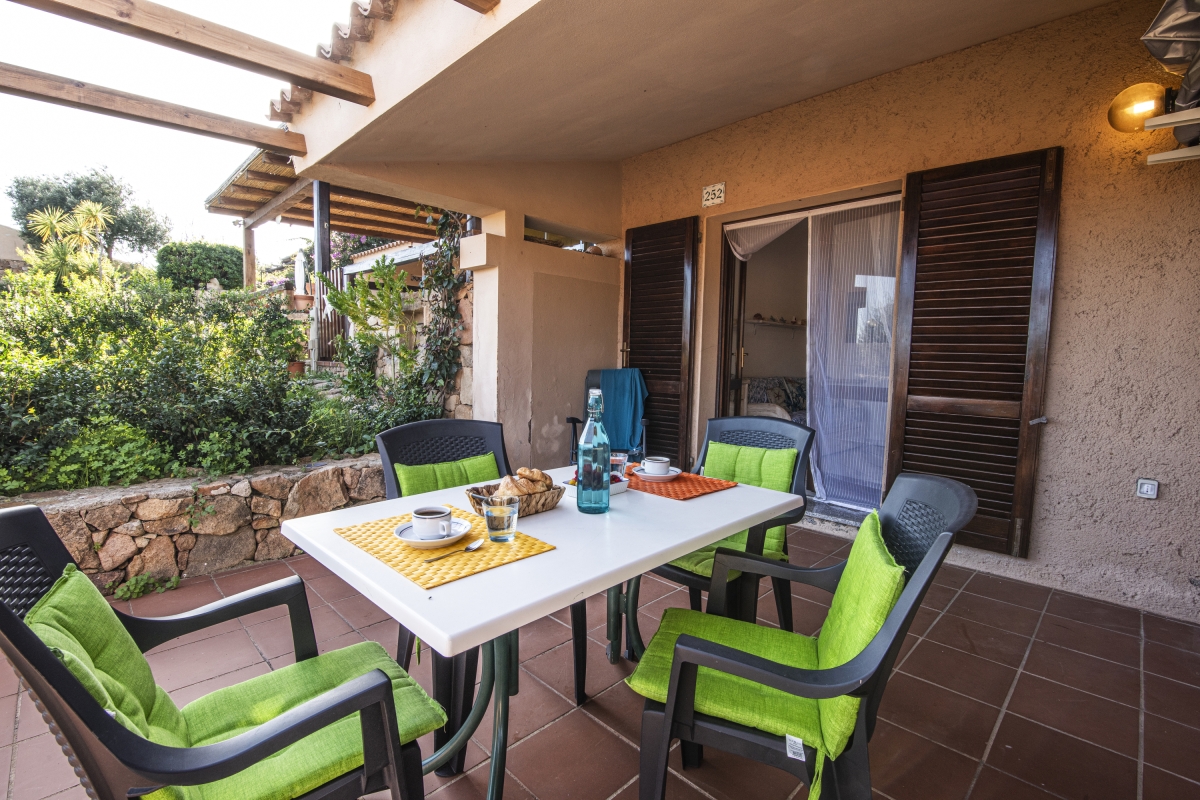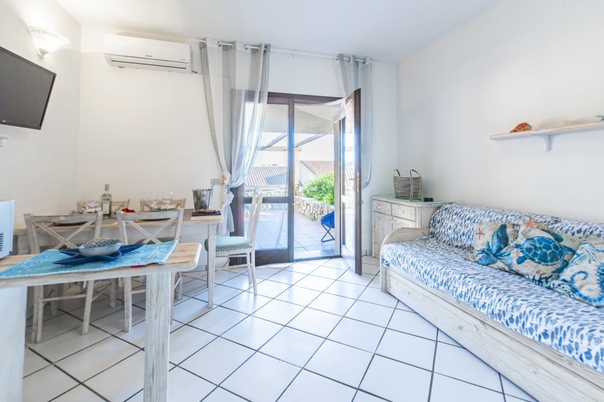 Set amidst greenery, this guesthouse offers a serene retreat with quiet surroundings and beautiful beaches nearby. Inside, an open-plan living room invites you with a cosy sofa, a flat-screen TV and a dining table with chairs, offering pleasant outside views. The adjoining area transitions seamlessly into a well-equipped kitchen, with a cooker hob, a coffee machine, an electric kettle, a microwave, and a fridge with a freezer. A well-maintained terrace with an outside dining area can be accessed directly from the living room, providing an ideal spot for dining al fresco.