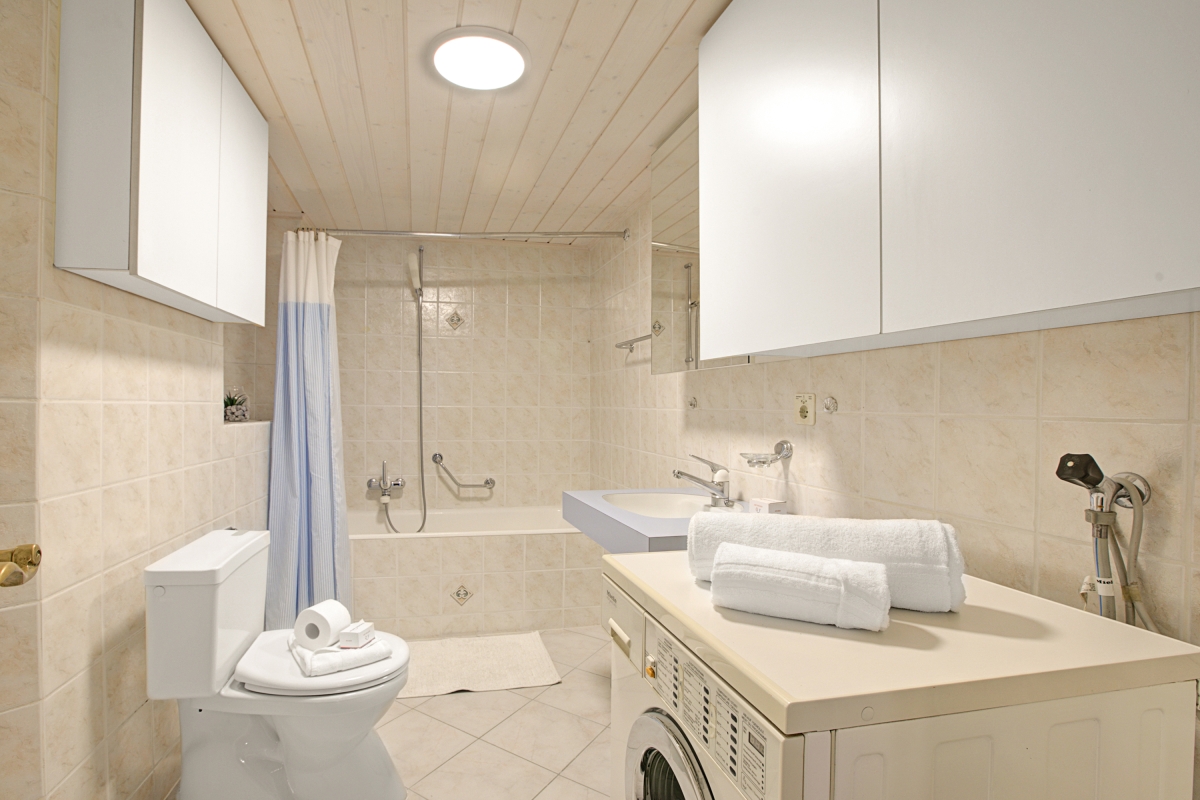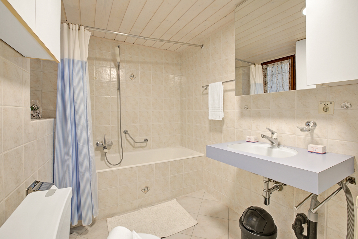 Bathroom 1: The bathroom is fitted with a shower in the bathtub, a washbasin and a WC