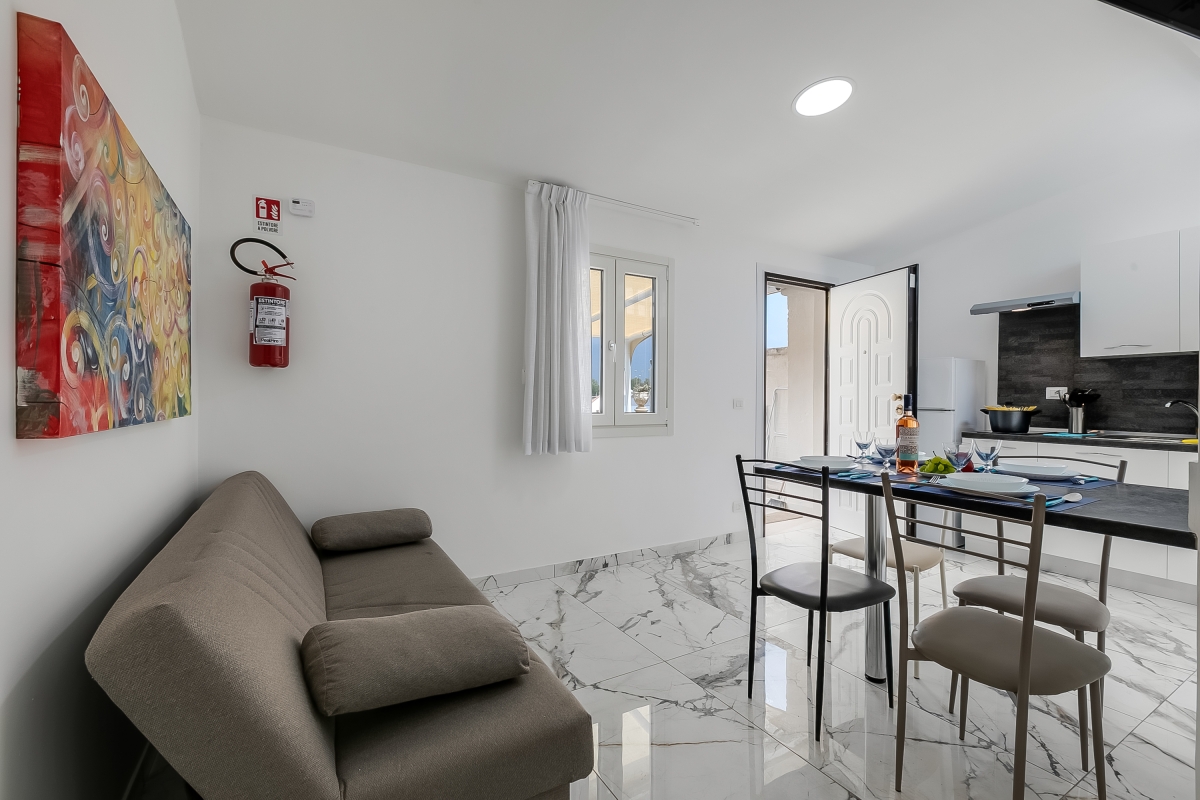 The apartment is reached via an exterior staircase onto a covered balcony, which serves as an outside dining room. Inside the open plan living space is furnished with a sofa, a digital flat-screen TV, a dining table and a new, fitted kitchenette. The kitchenette is equipped with an induction hob, a fridge freezer and a Mokka coffee machine.