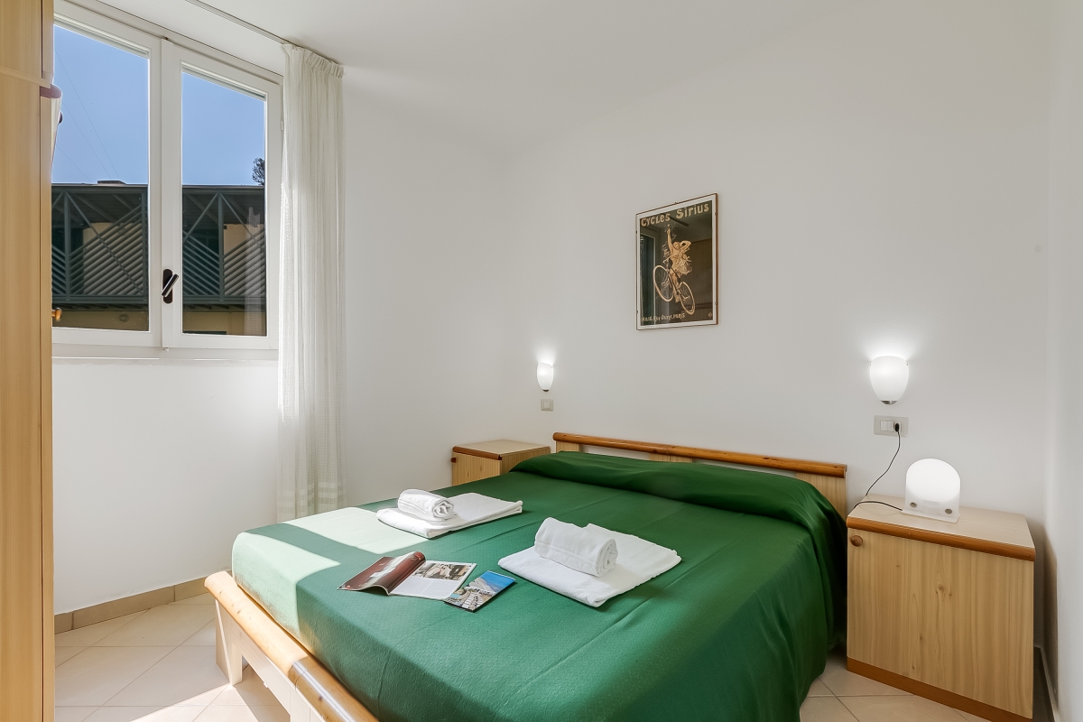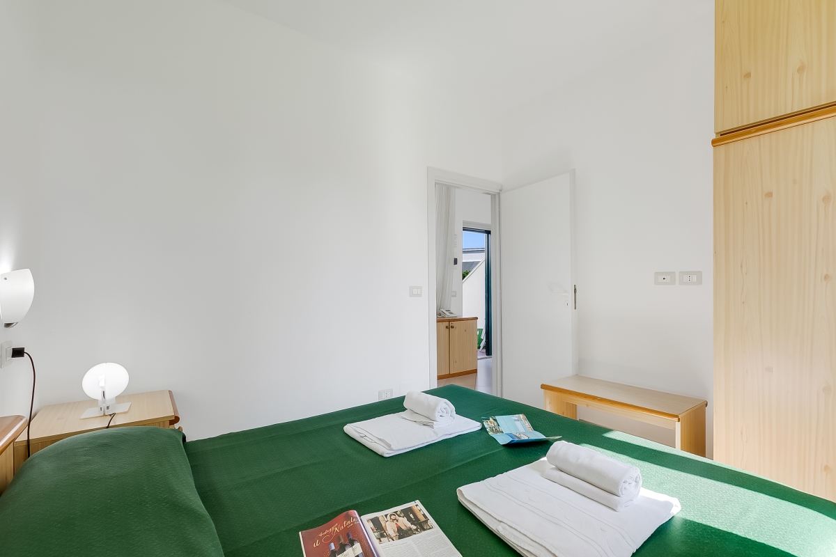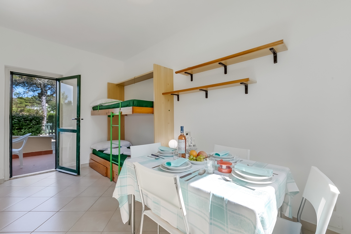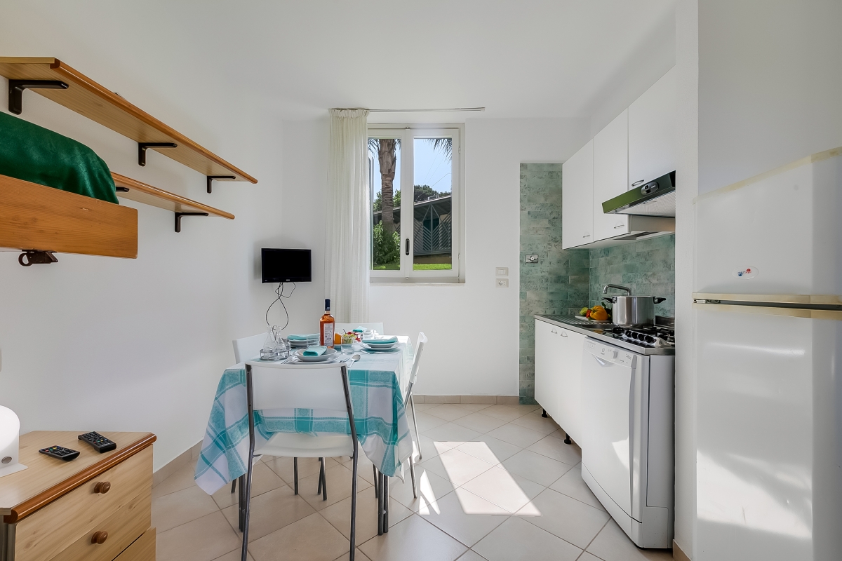 The ground-floor apartment for 4 people consists of an open-plan kitchen-dining area with a table for 4 and a tiled, fitted kitchen equipped with a cooker hob, Mokka coffee maker and a fridge/freezer.