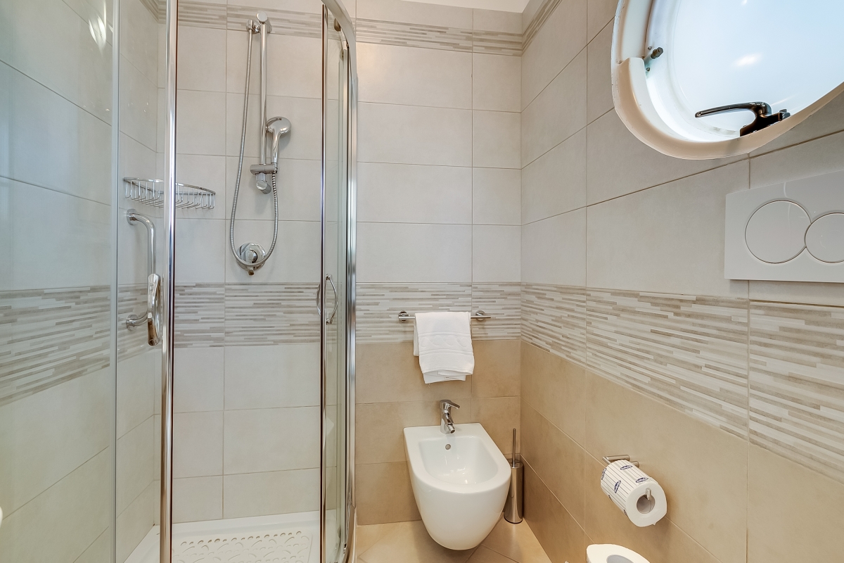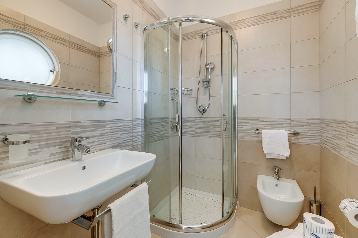 The modern bathroom is equipped with a box shower, basin, bidet and WC.