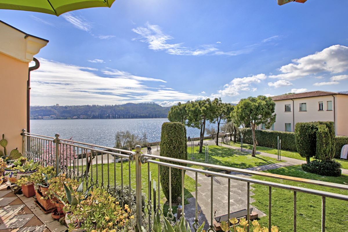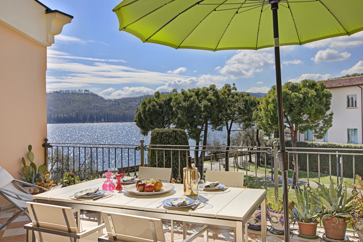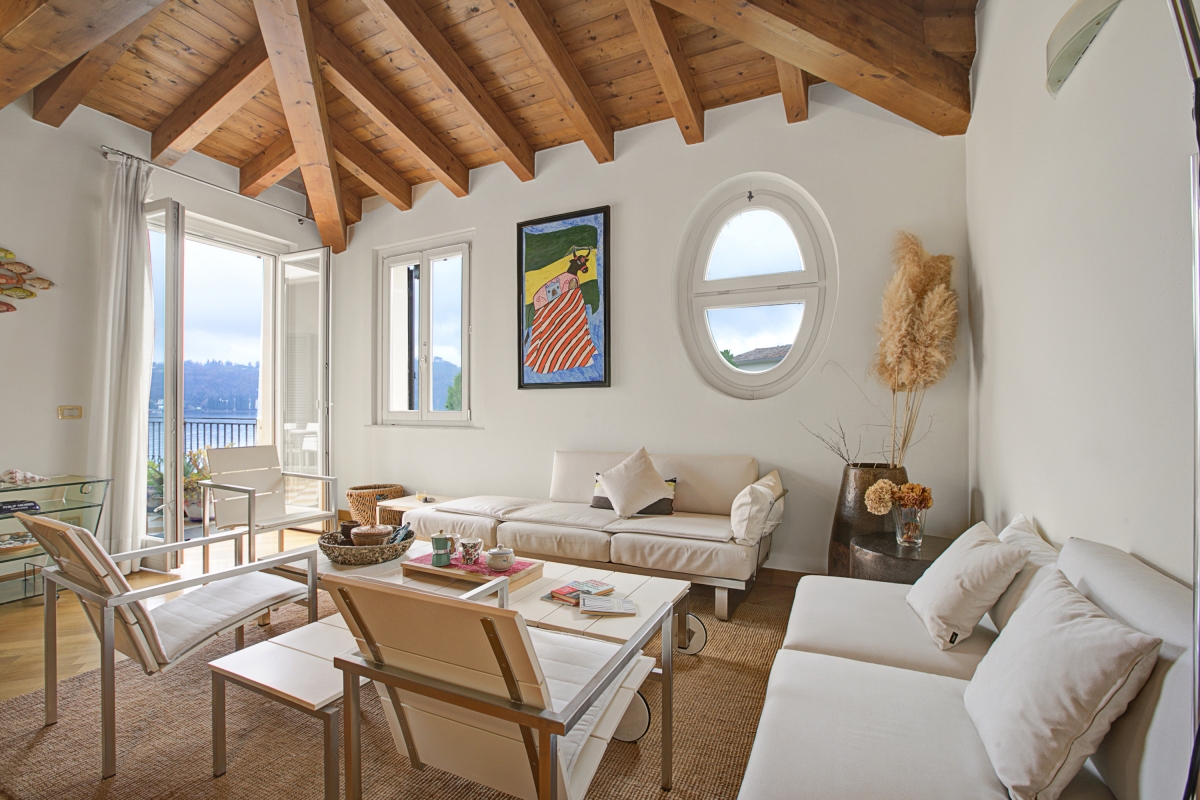 Nestled along the picturesque lakeshore of Salò, this luxurious apartment offers an elegant retreat with breathtaking lake views. The thoughtfully designed interior is decorated with exquisite wooden-beamed ceilings, adding warmth and charm to the space. A 2-bedroom apartment on the second floor, it comfortably accommodates up to 4 guests. The beautifully furnished living room features plush sofas, stylish chairs, a sleek glass table, and a showcase, all positioned to take in the serene lake views. The doors of the living area open onto a spacious terrace, where an outdoor dining area invites guests to savor meals while soaking in the tranquil scenery.