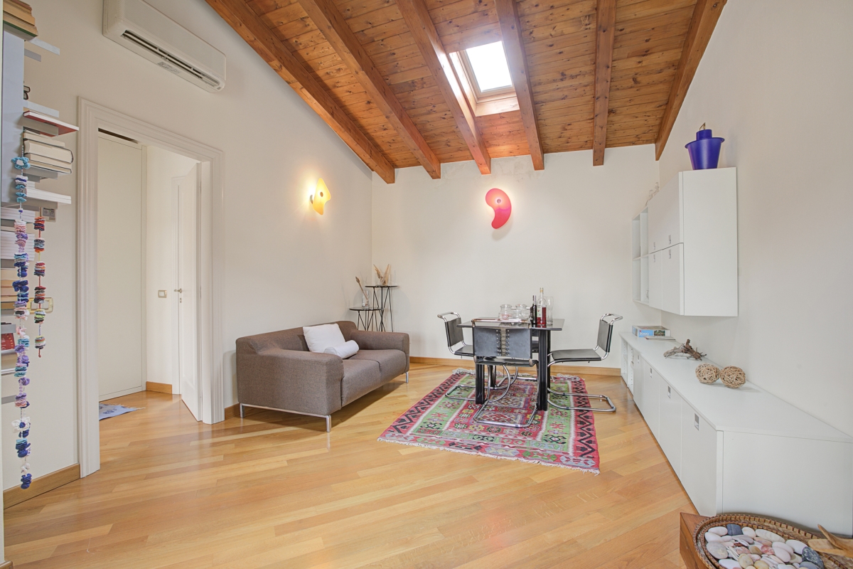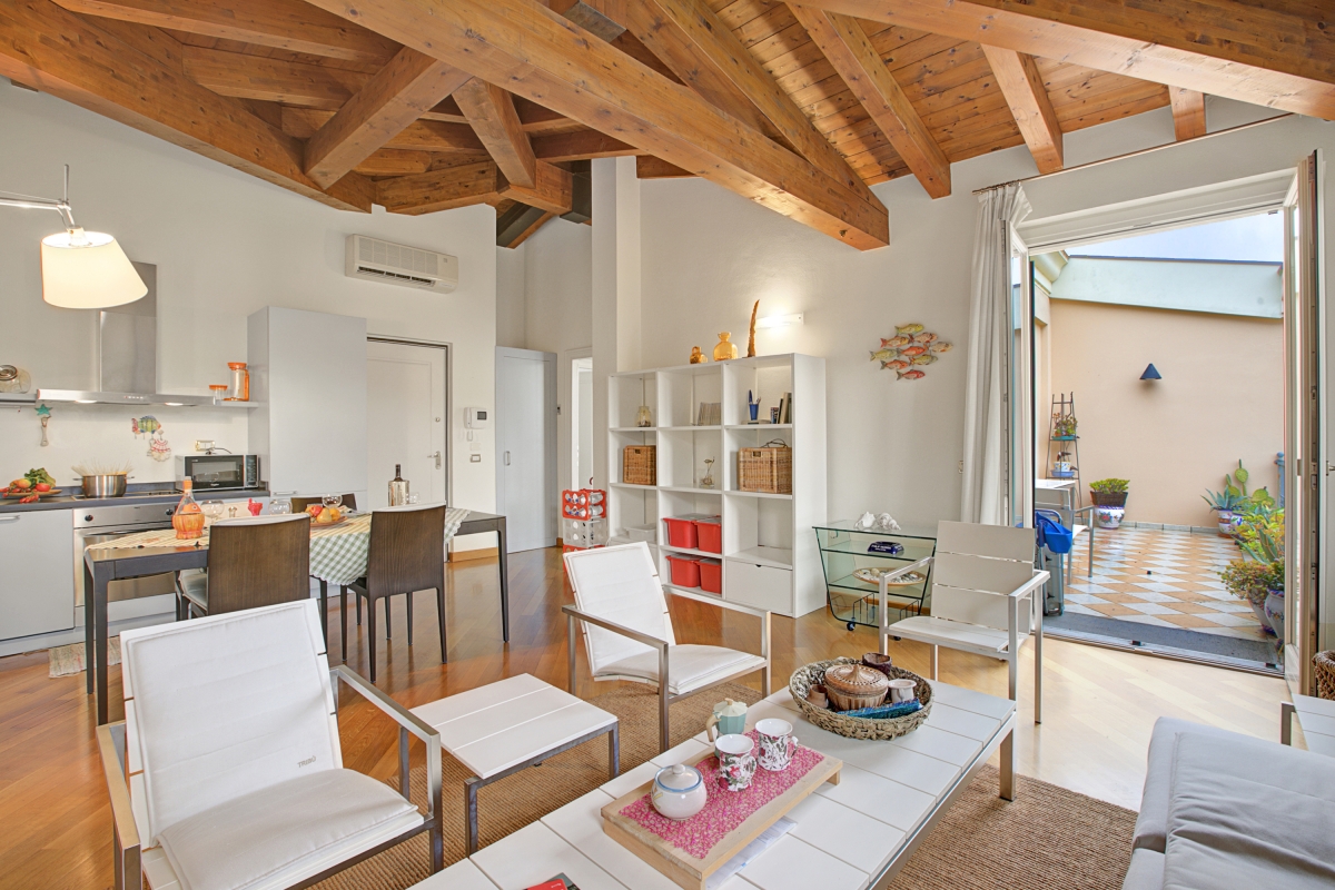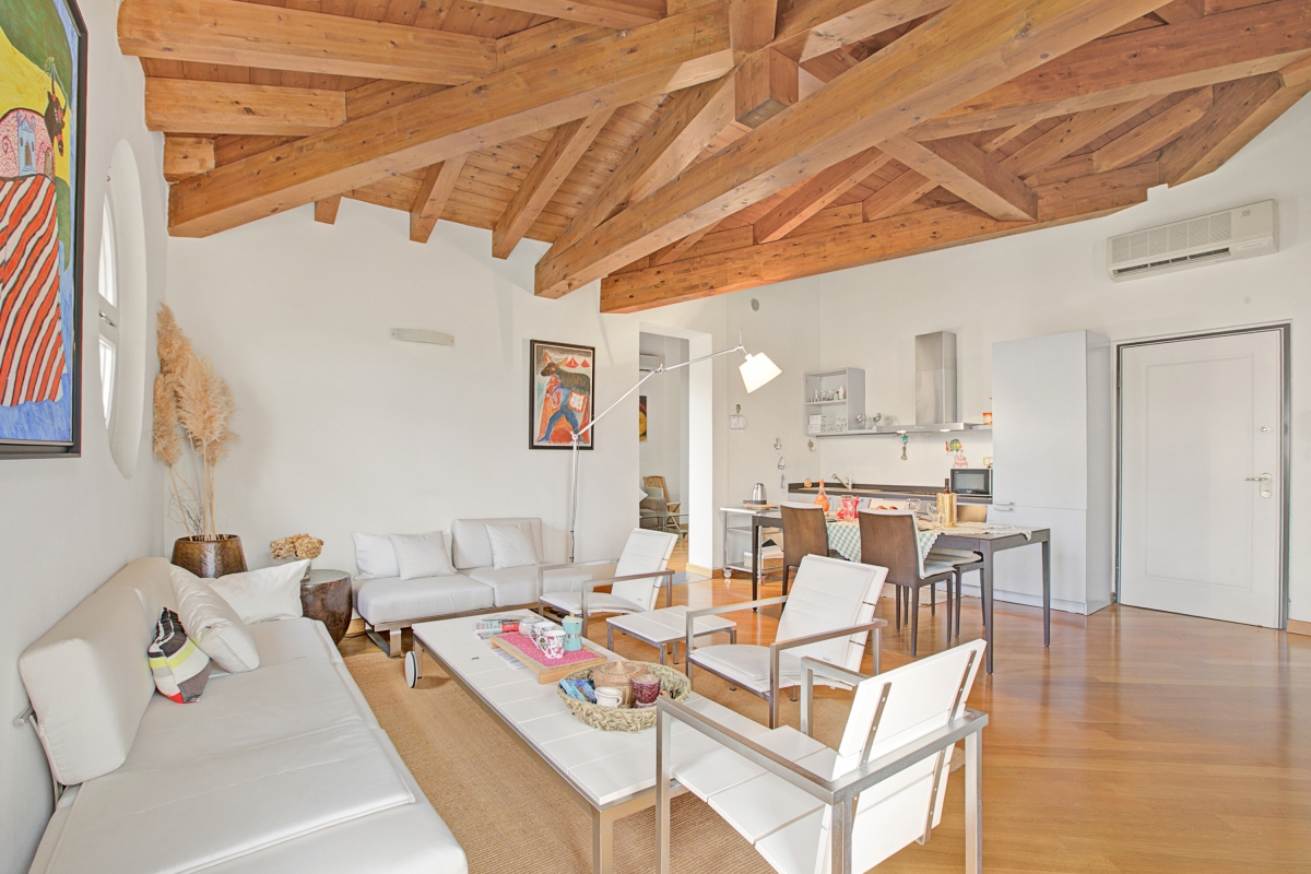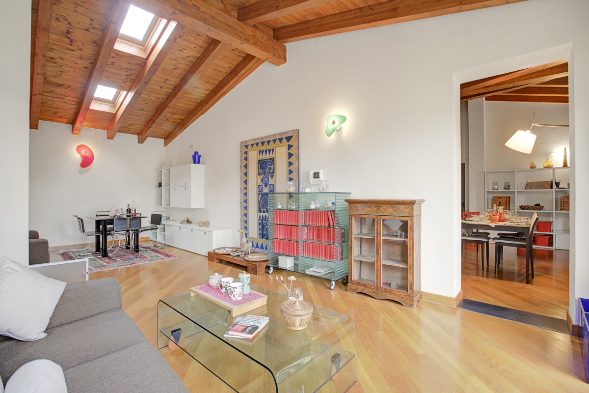 Nestled along the picturesque lakeshore of Salò, this luxurious apartment offers an elegant retreat with breathtaking lake views. The thoughtfully designed interior is decorated with exquisite wooden-beamed ceilings, adding warmth and charm to the space. A 2-bedroom apartment on the second floor, it comfortably accommodates up to 4 guests. The beautifully furnished living room features plush sofas, stylish chairs, a sleek glass table, and a showcase, all positioned to take in the serene lake views. The doors of the living area open onto a spacious terrace, where an outdoor dining area invites guests to savor meals while soaking in the tranquil scenery.