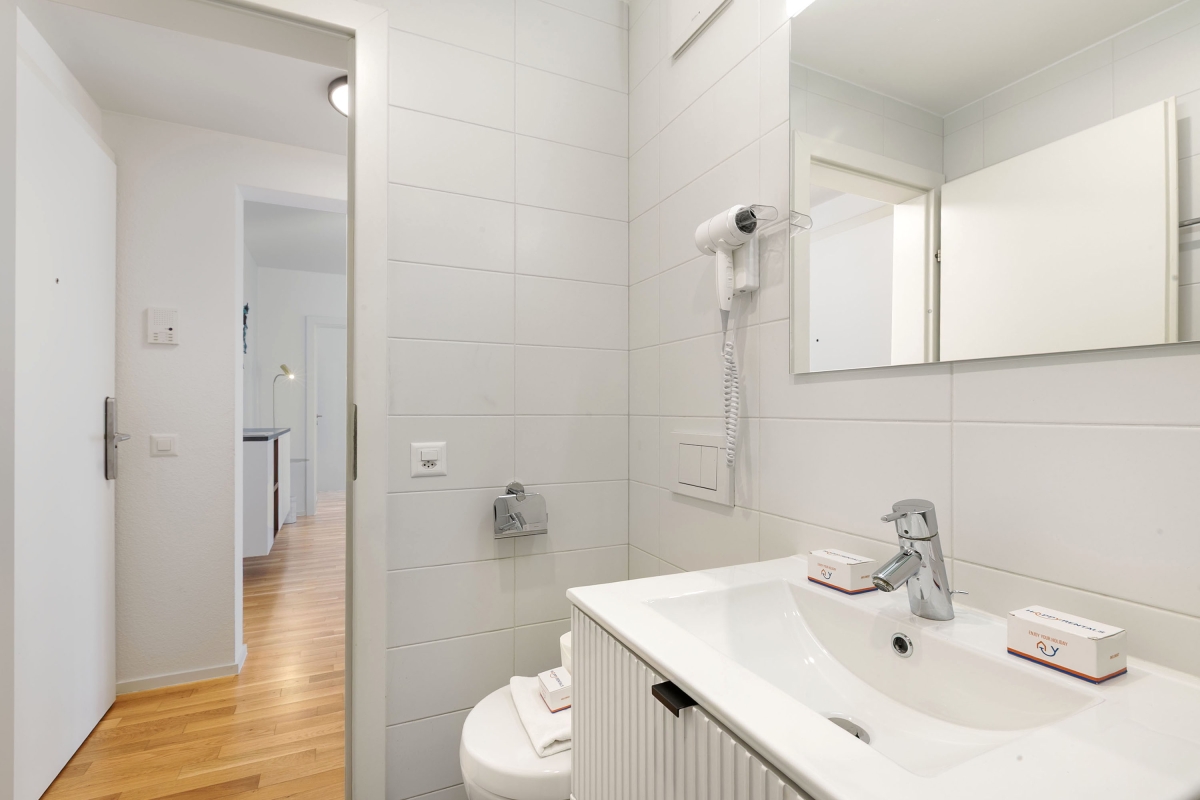 The apartment is stylishly appointed with everything guests need for a comfortable stay, whether you are in Lugano for business or an exciting city break. The living area has a comfortable sofa, a flat-screen TV, plus a dining table and chairs. The modern kitchen is off the living room, separated by a breakfast bar. It is well-equipped with a cooker hob, oven, microwave, dishwasher, fridge/freezer and Nespresso machine. Glass doors lead from the kitchen out to a private balcony.