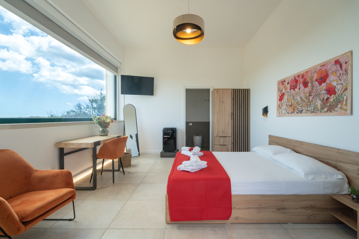 If you are looking to escape into unspoiled nature but still want modern comforts then the Panoramic King Room at Masseria San Biagio is the perfect option. This stunning modern bedroom for 2 enjoys stunning views over the countryside. Set in beautiful grounds with a large swimming pool, it is the ideal base for a couple who want to explore Salento but also relax in peaceful surroundings.