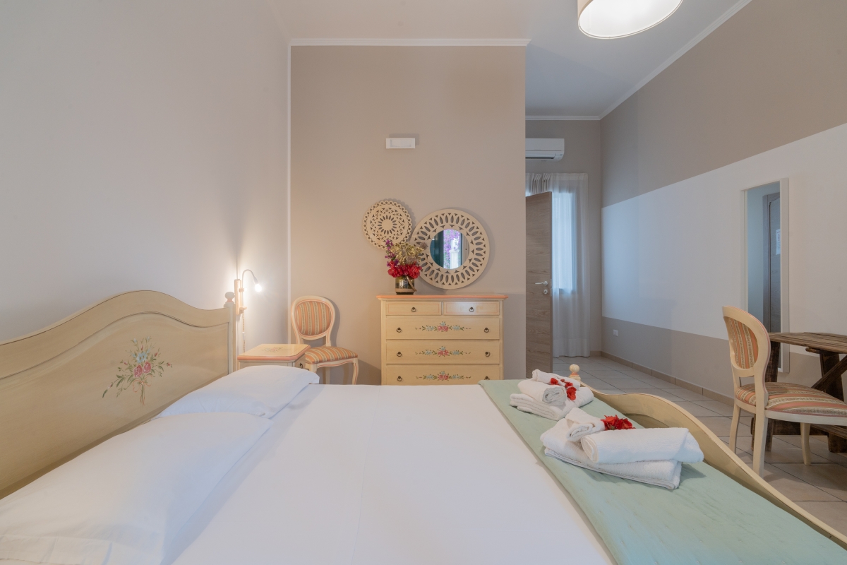 On the first floor, with direct access to the extensive terrace and shaded seating areas, the spacious room is furnished with a double bed, wardrobe, armchairs, writing desk, mini-fridge and flat-screen TV.
