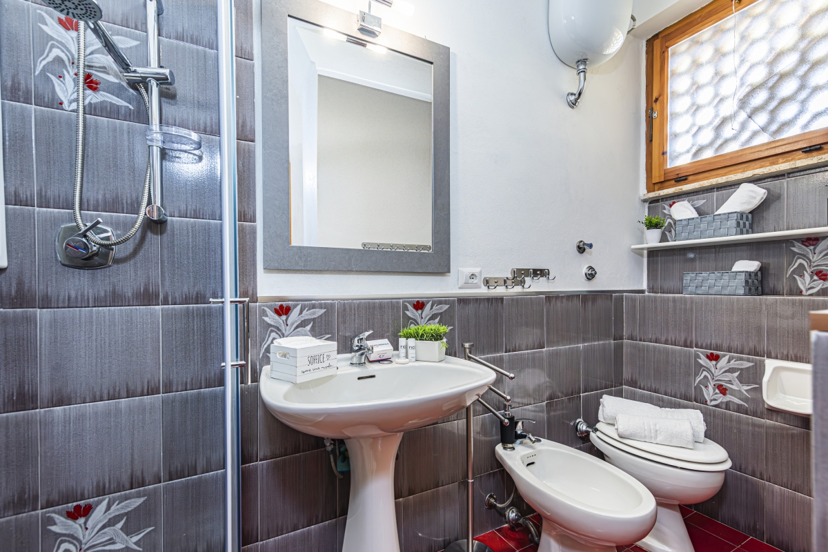 The attractively tiled bathroom has a shower, basin, bidet and WC.