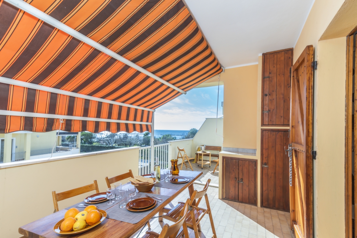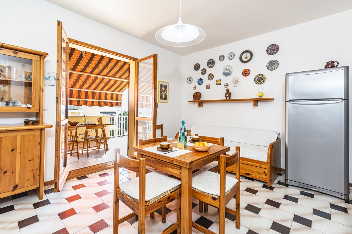 The open-plan living/dining room is simply decorated with attractive wooden furniture, including a comfortable sofa, a flat-screen TV and a dining table. Double glass doors lead out onto a spacious balcony with sea views. It is furnished with a dining table for meals al fresco, a BBQ and an adjustable sun shade.