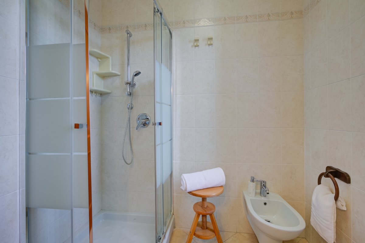 The tiled bathroom has a glass shower, basin, WC and bidet.