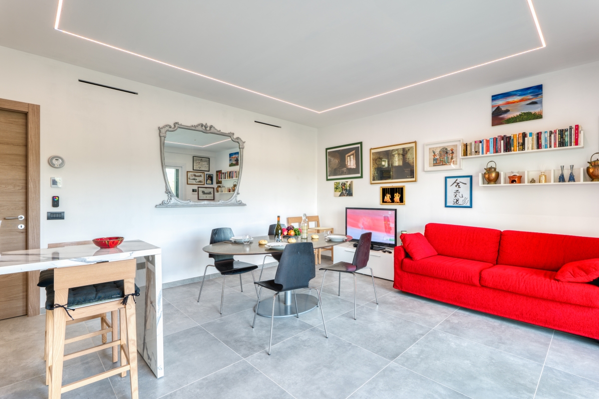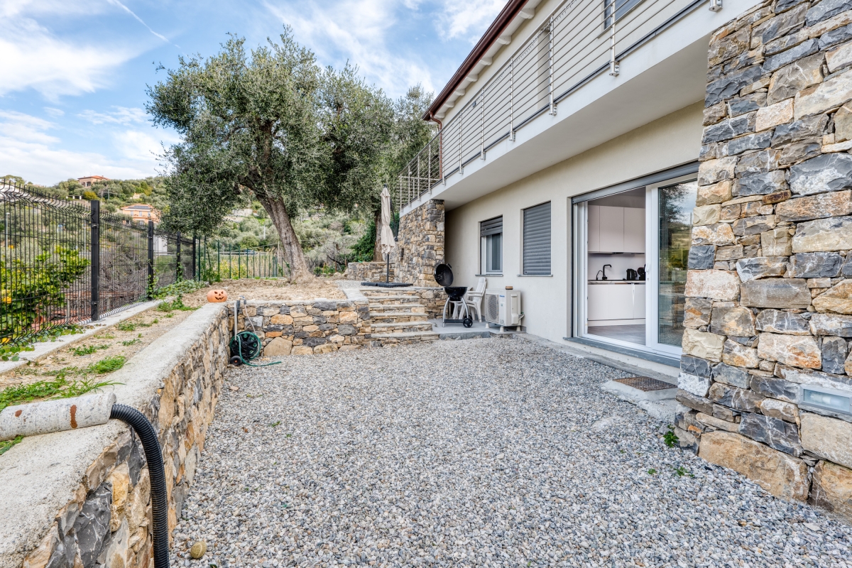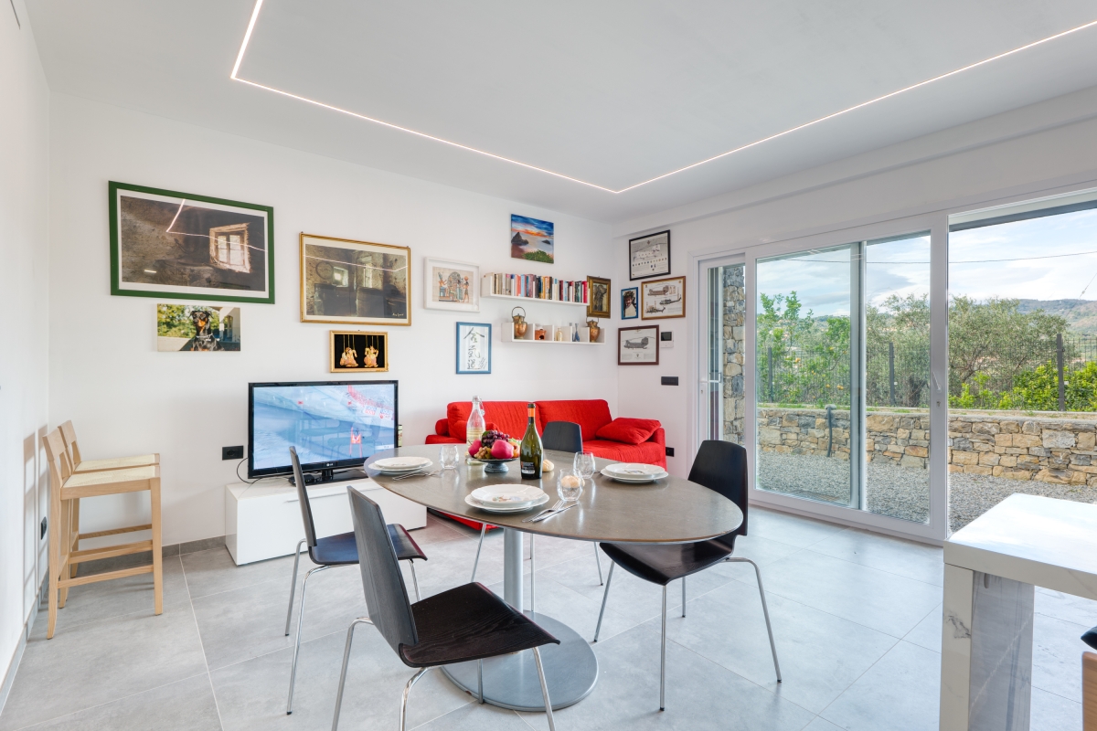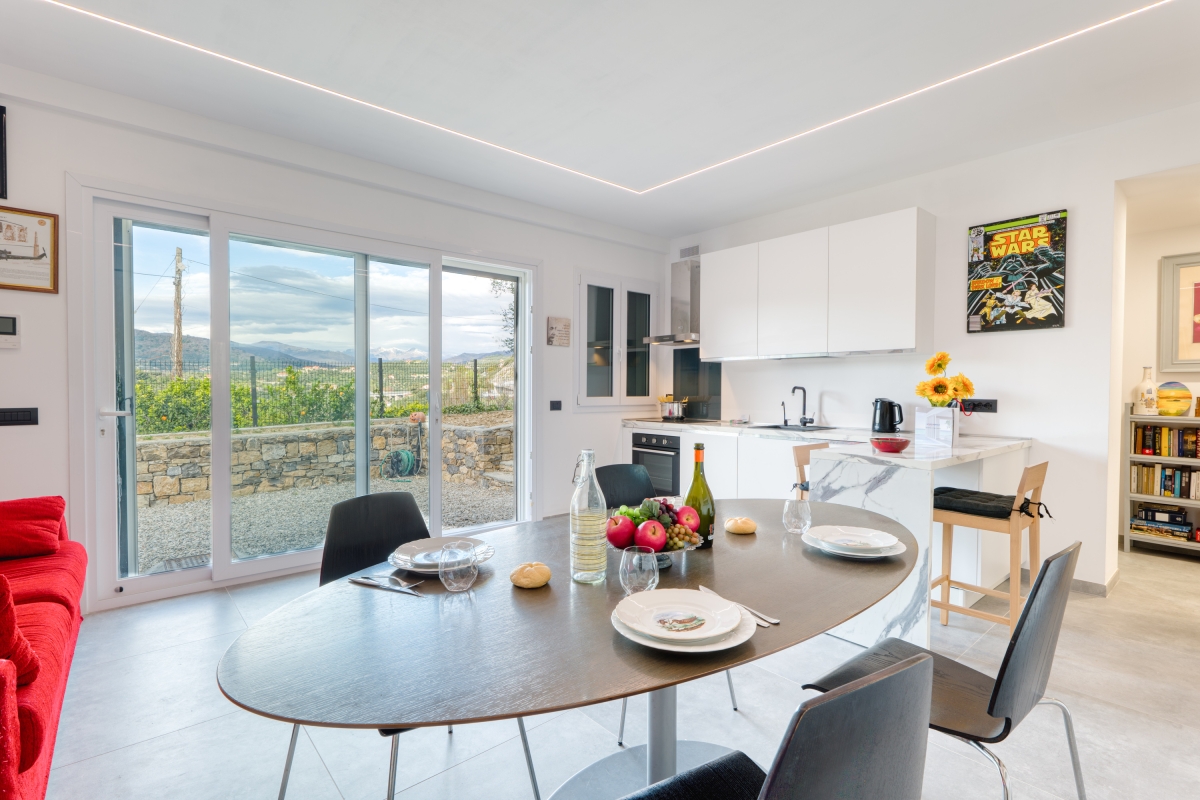Surrounded by greenery, this contemporary apartment for 5 is quietly located on a hillside in the outskirts of Imperia, the “town of olive oil”.