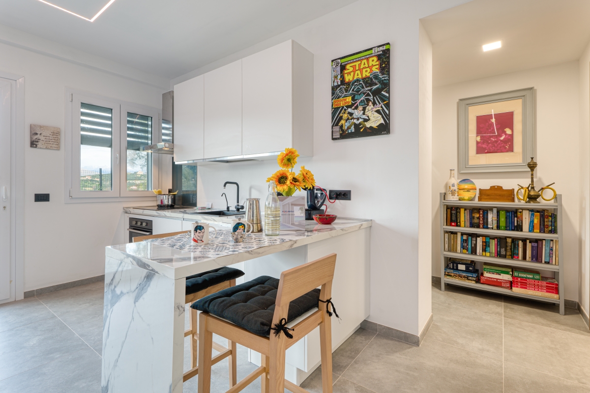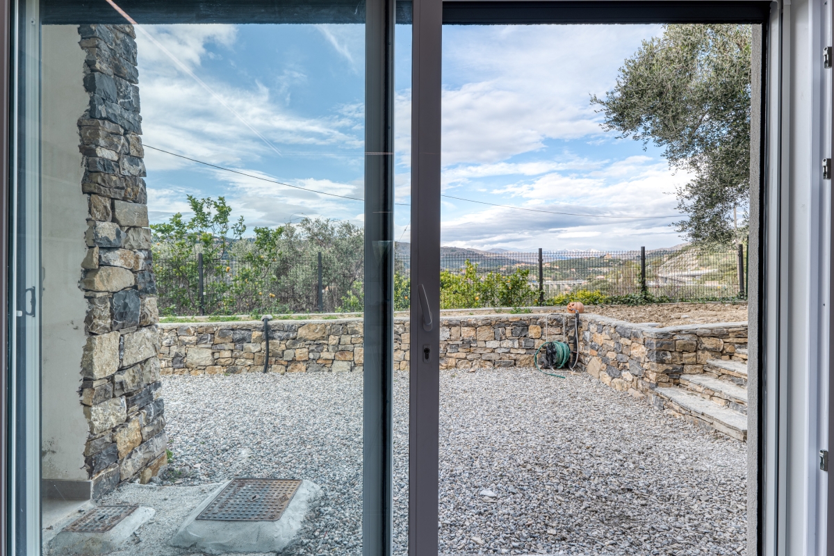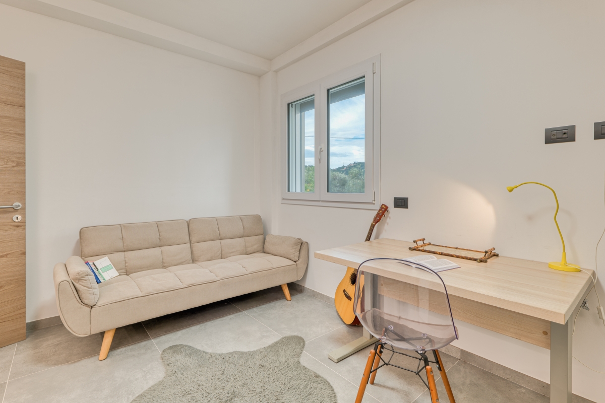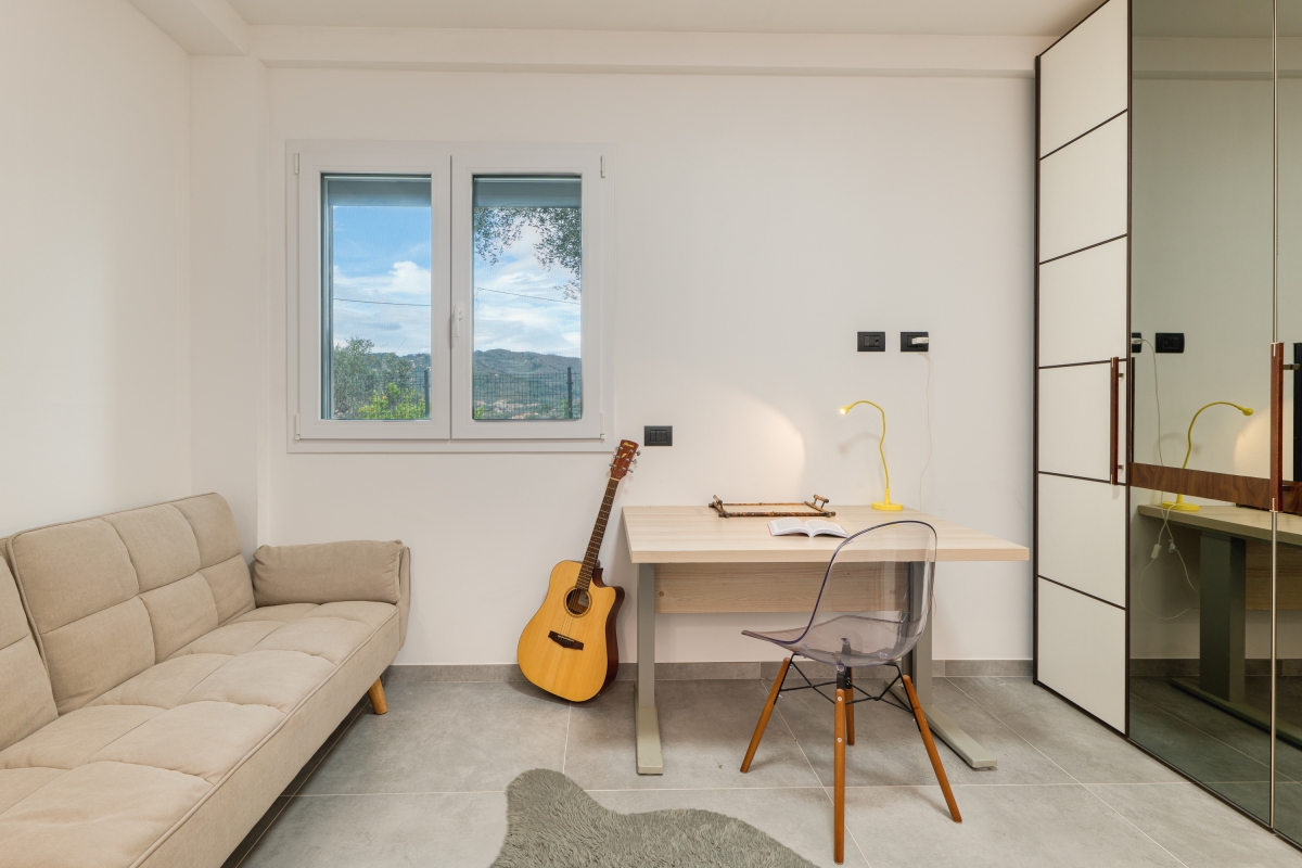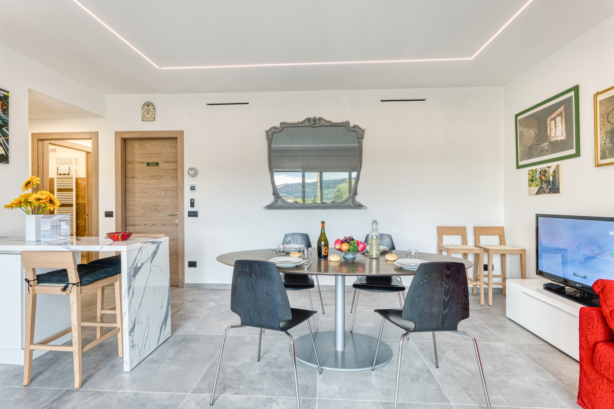 Surrounded by greenery, this contemporary apartment for 5 is quietly located on a hillside in the outskirts of Imperia, the “town of olive oil”.