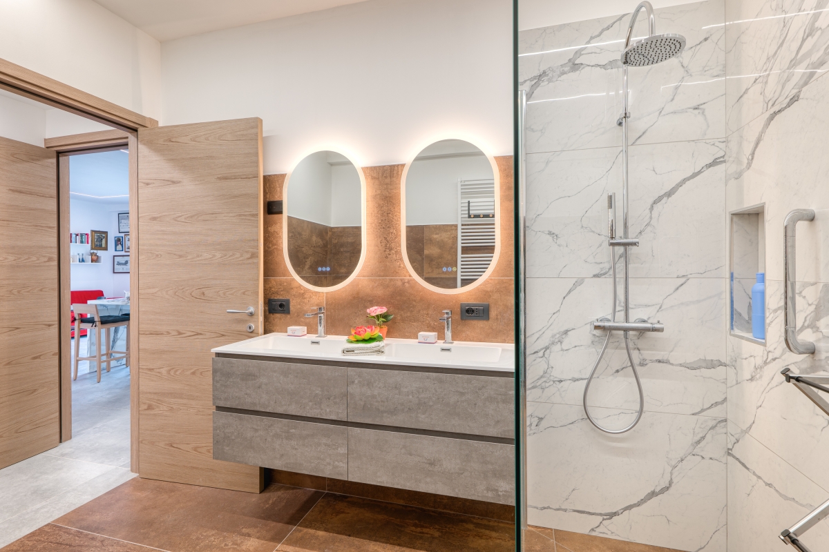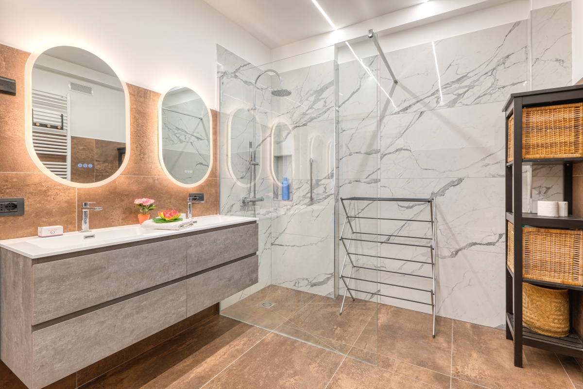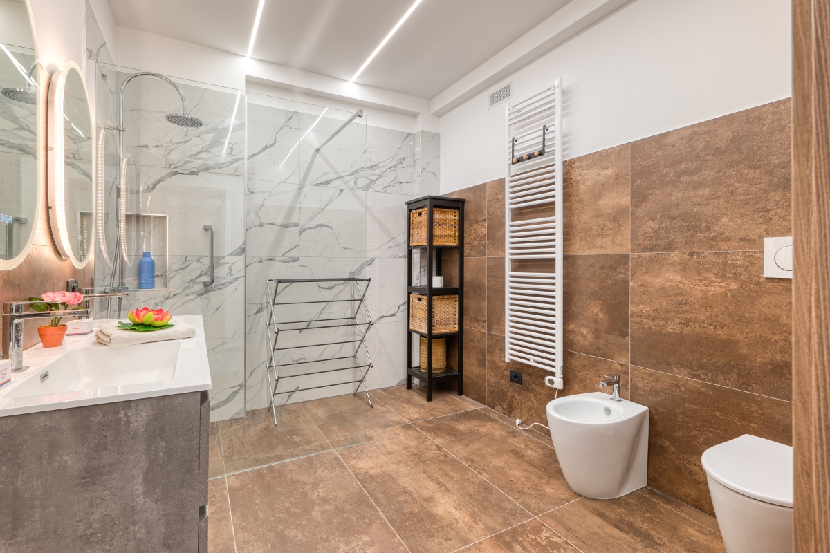 The modern bathroom is fitted with a large shower, two washbasins, a bidet and a WC
