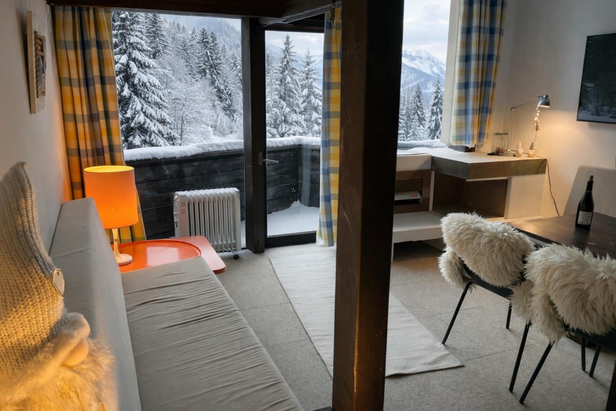 A glass door leads from the living area to a private balcony where guests can enjoy views out over the forest and mountainside.