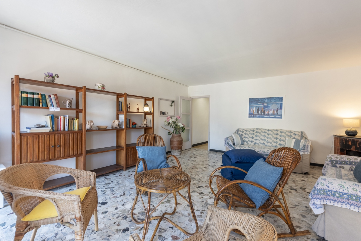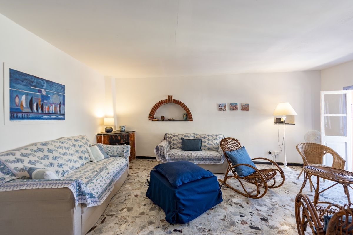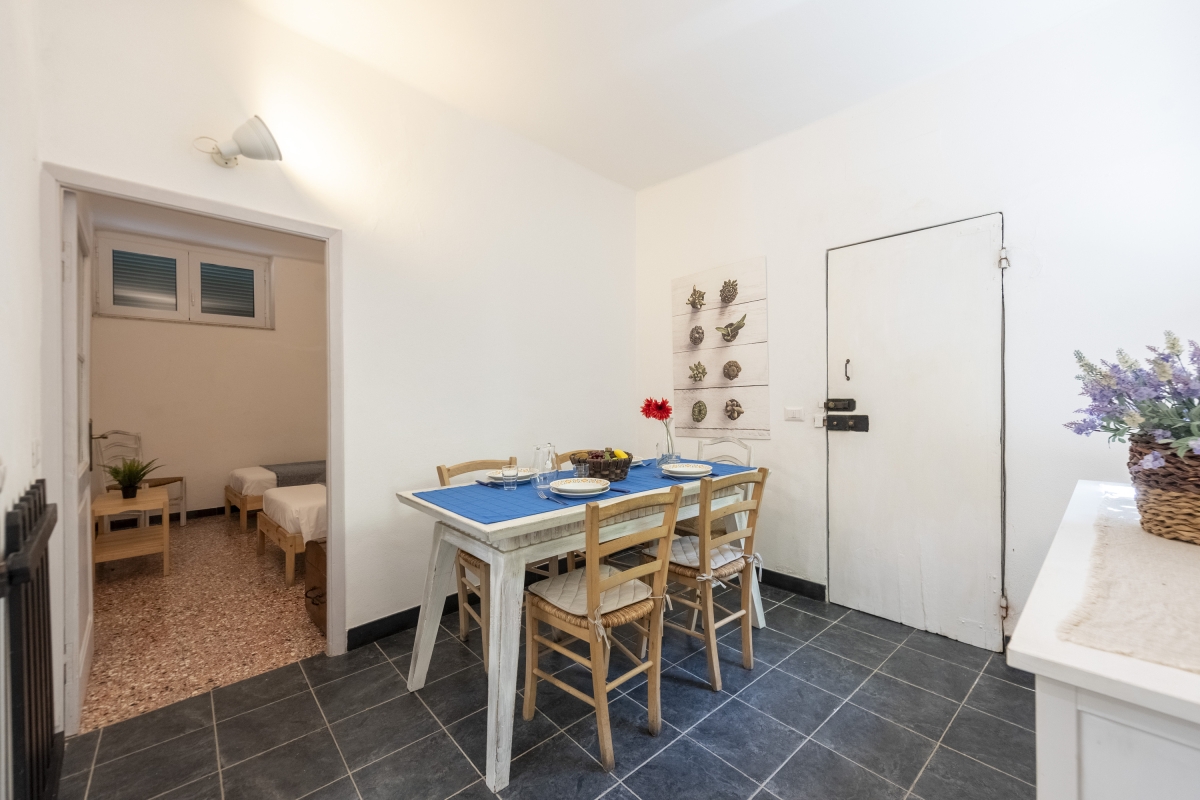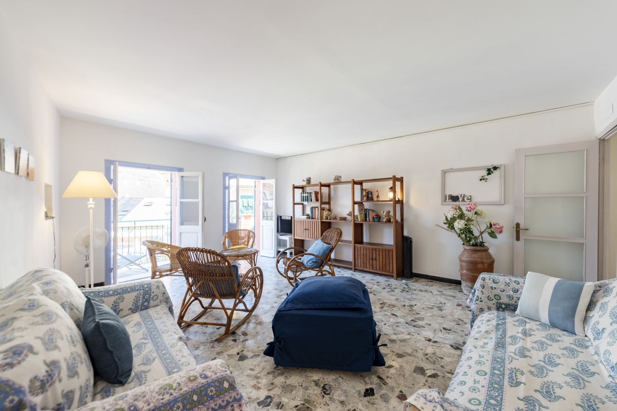 The apartment has an airy living room with two sets of French windows opening onto the balcony. Inside there is a sofa and cane armchairs. The separate, neat kitchen is well-equipped with a cooker hob, oven, Moka coffee maker and a fridge. Around the corner on the landing, guests will find the dining area with a table for 5 people.