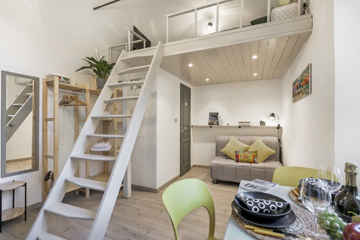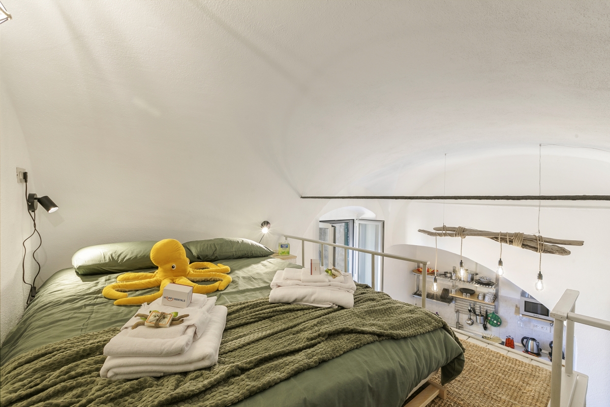 Located on the first floor, the apartment has a very sunny position with cosy interiors. The open living room has a sofa, dining area and a fully equipped kitchen with a coffee machine, electric kettle, microwave, fridge, and induction hob. A flight of stairs will lead you to the bedroom with a TV. The apartment is air-conditioned.