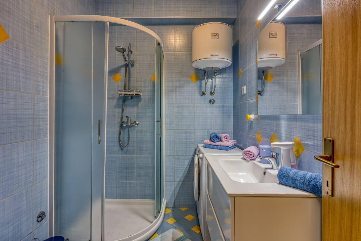 Bathroom 1: The bathroom is equipped with a shower, a washbasin and a WC.