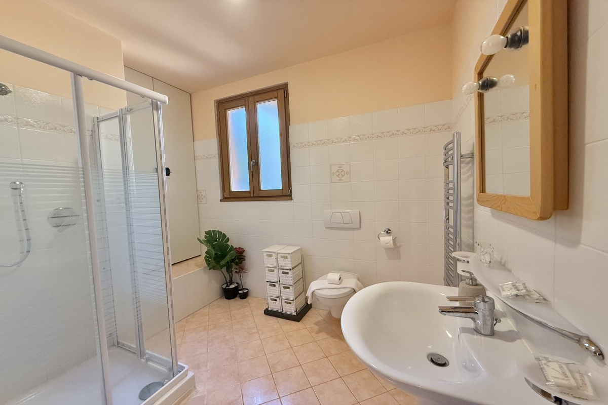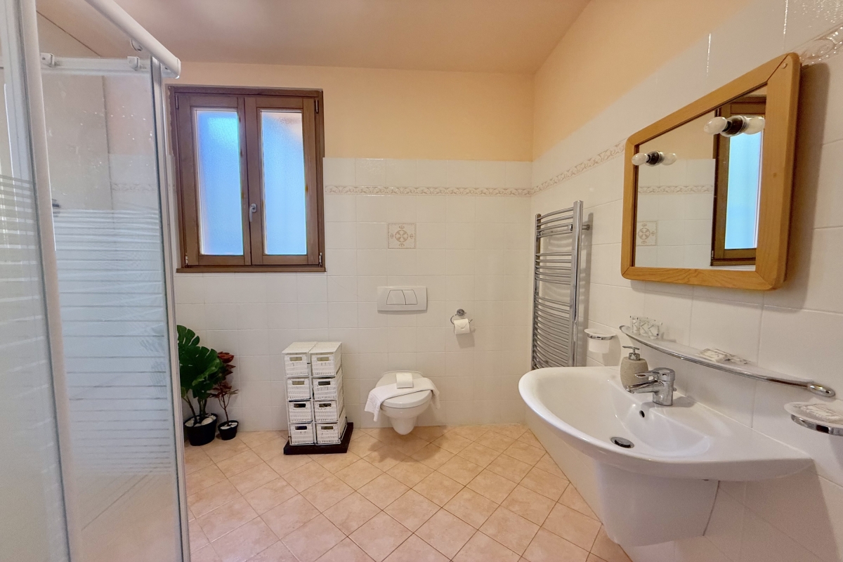 Bathroom 3: This bathroom is equipped with modern fixtures like a shower, a wash basin and a WC.