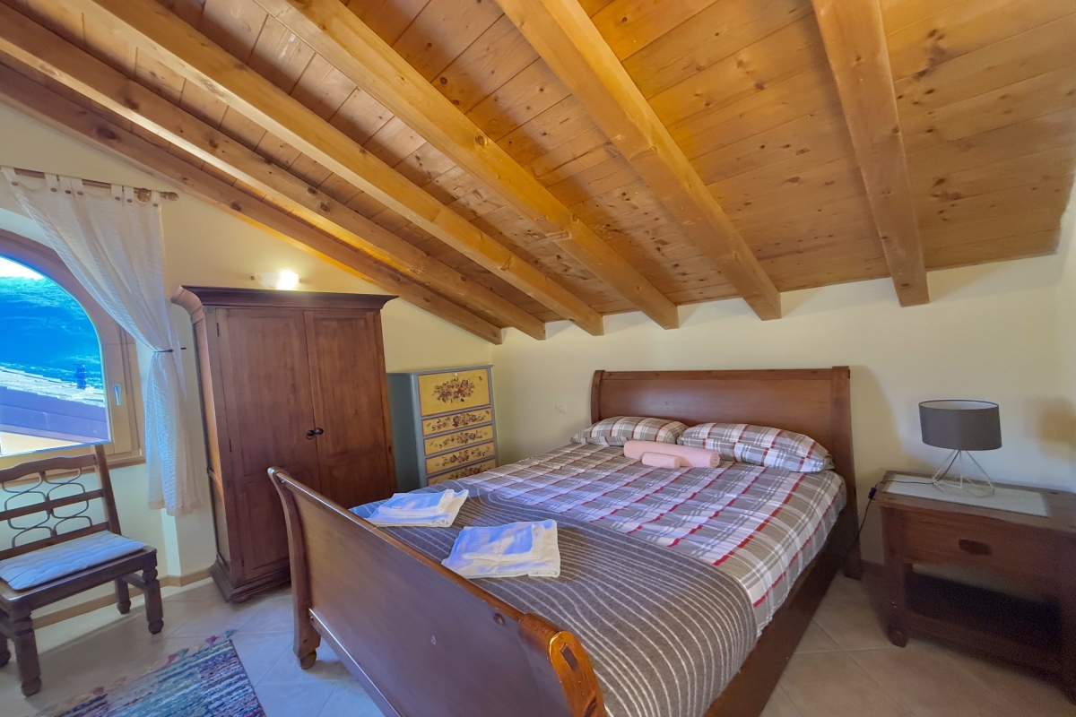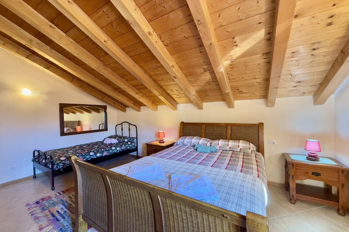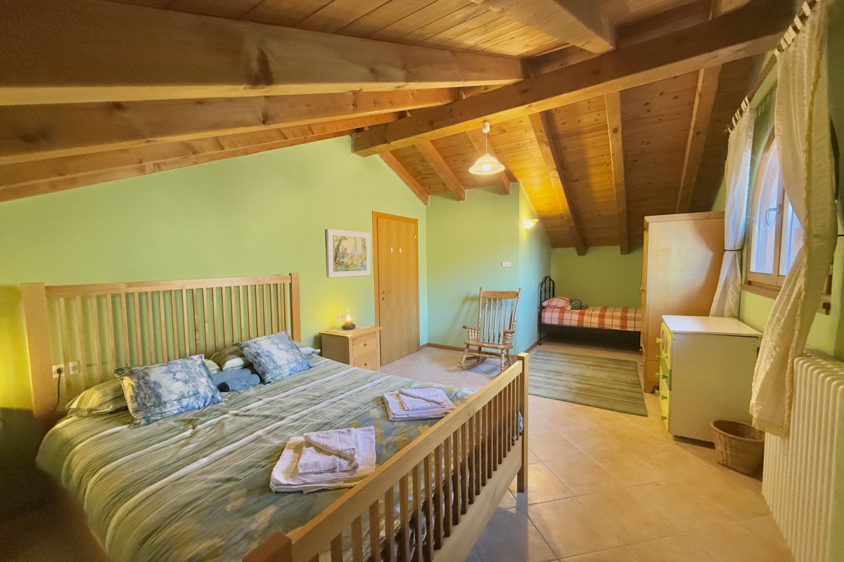 Bedroom 5: This bedroom is on the second floor and has a double bed, a single bed and a wardrobe.