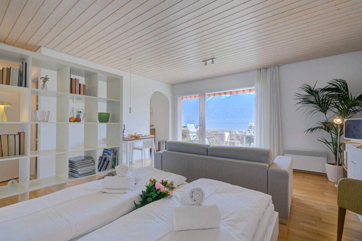 The living room features a double bed, a wardrobe, and a balcony with breathtaking views.