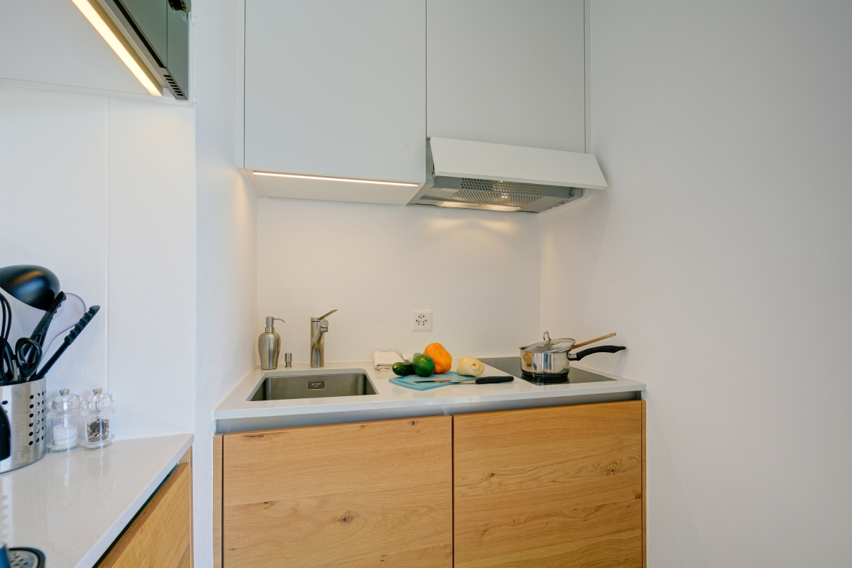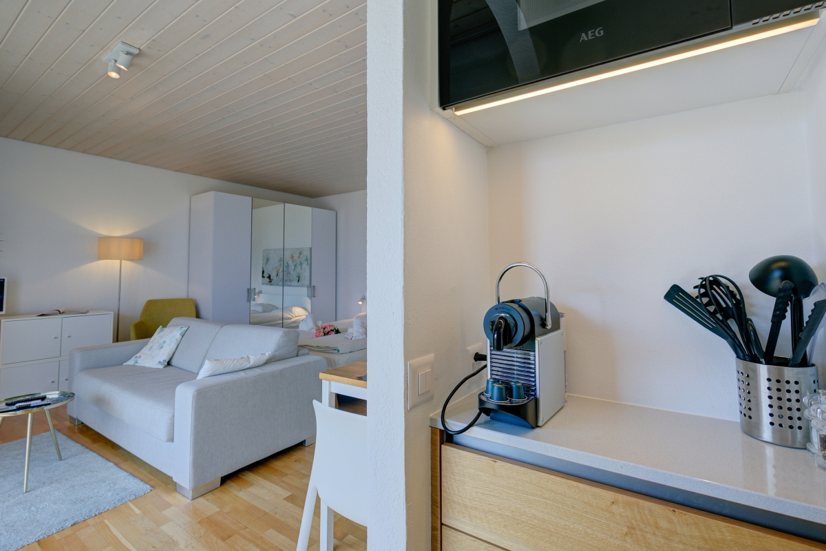 Inside, the bright and welcoming space features a double bed, a modern bathroom with a shower, a living area with a digital TV and a spacious wardrobe. The kitchen includes a coffee machine, microwave, fridge, induction hob, and dining area for separate meals.