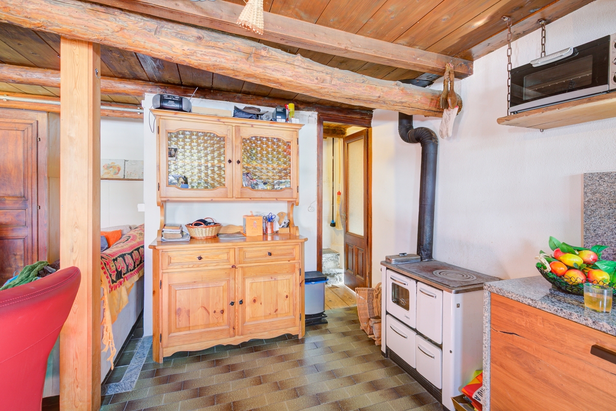 The living room is very warm and inviting, featuring a modern pellet stove and a fully equipped kitchen furnished with traditional mountain furniture, including a quaint dining table.
