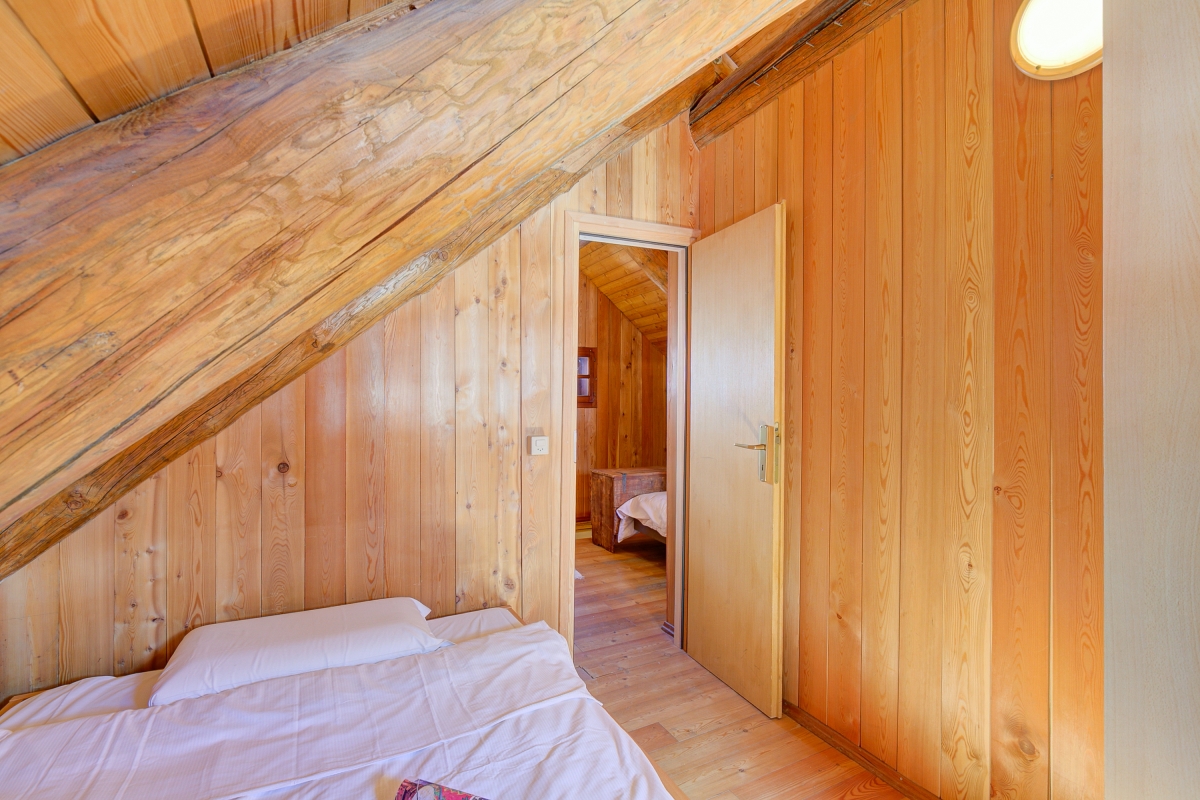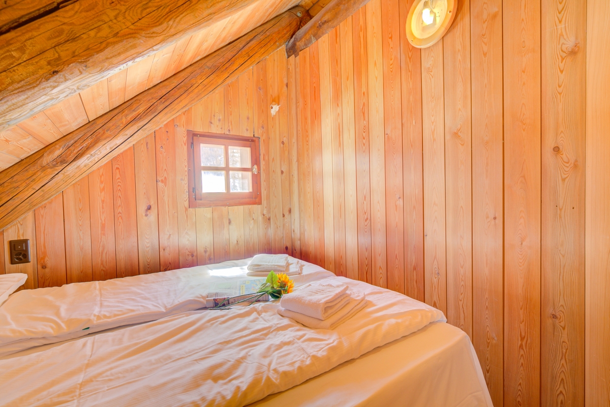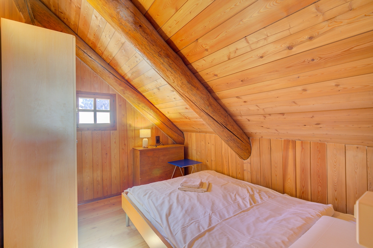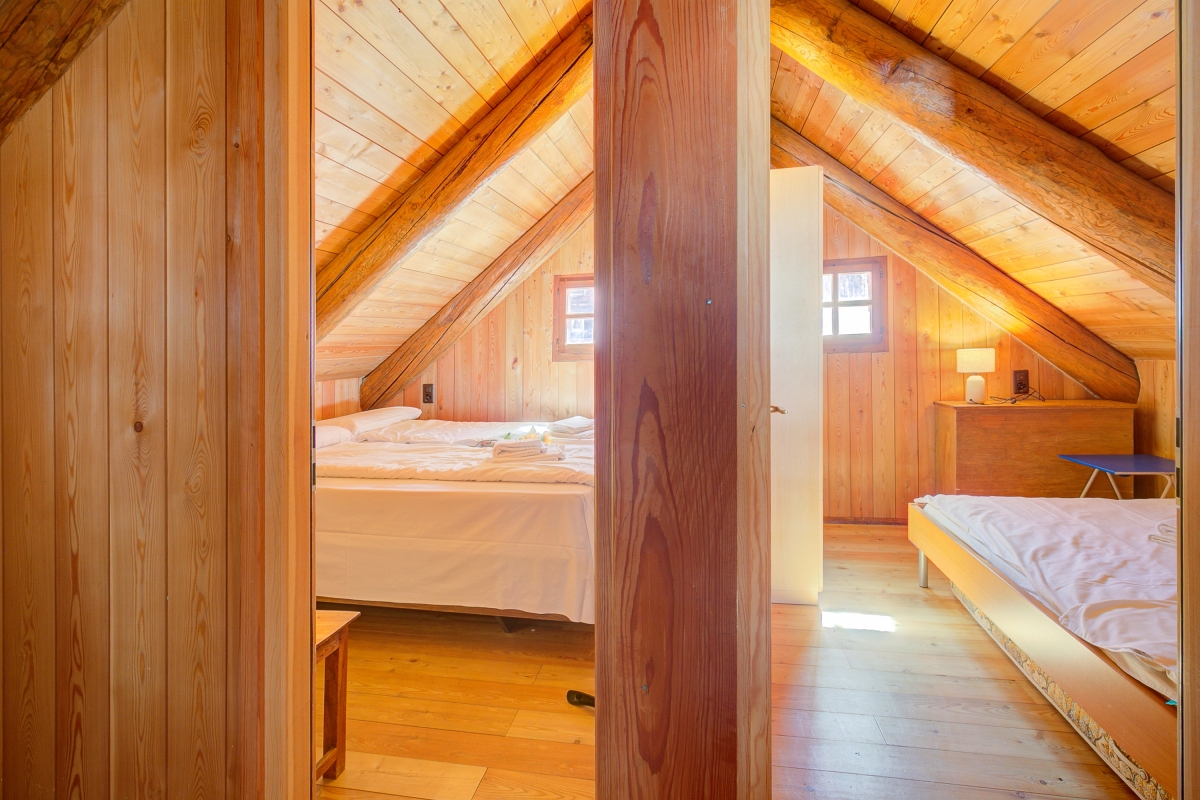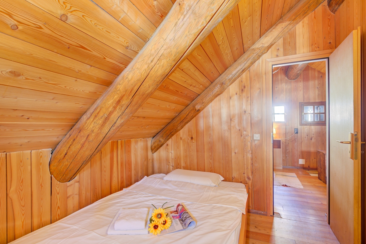 The internal wooden staircase leads to the upper floor, which sleeps six people in three different rooms. The first bedroom, with a 140x200 cm double bed, is located just off the stairs. Next to it are two separate bedrooms, one with a 140x200 cm bed and the other with a 160x200 cm bed.