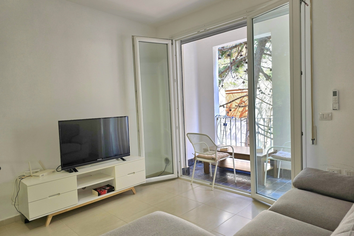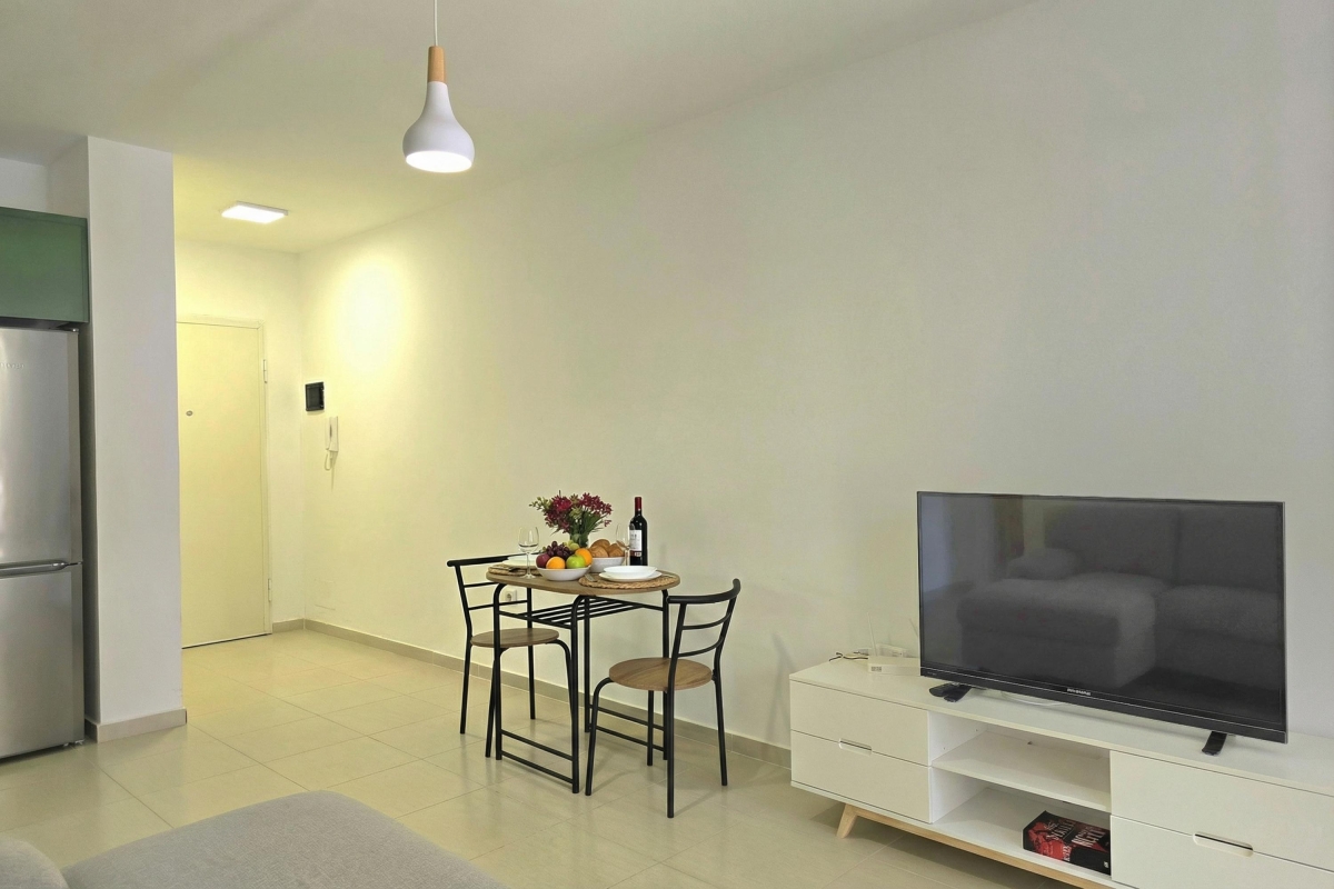 The airy open-plan living area is furnished with a contemporary sofa, flat-screen TV and a small dining table. The stylish kitchen is fully equipped with a cooker hob, oven, kettle and a fridge/freezer. French windows open to the private balcony with a table and chairs where guests can enjoy the sea breeze.