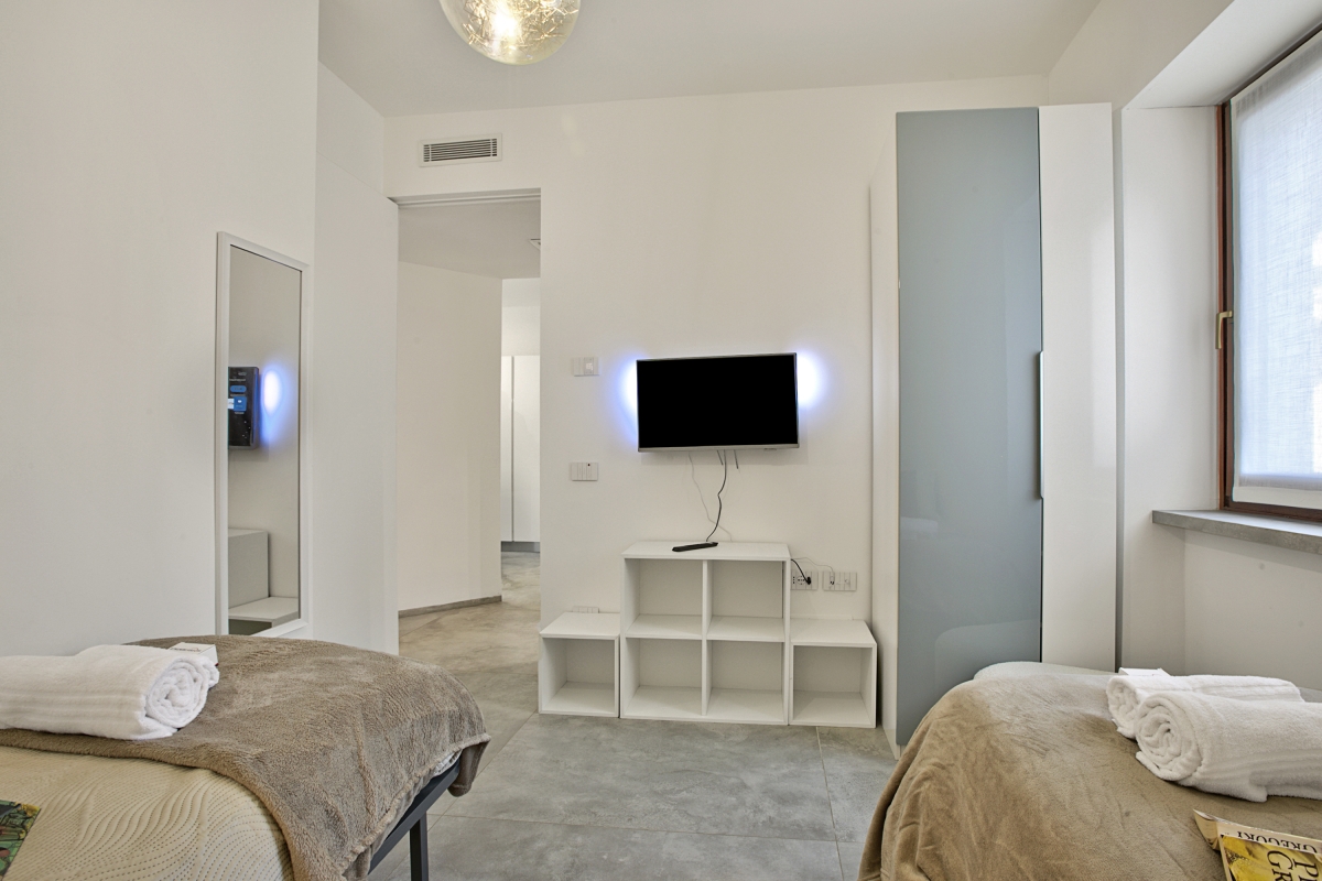 Bedroom 2: This bedroom has 2 single beds, a flat-screen TV and a wardrobe.