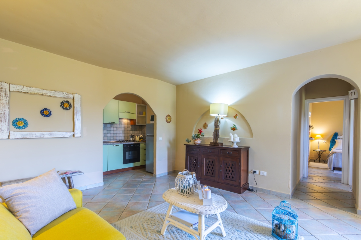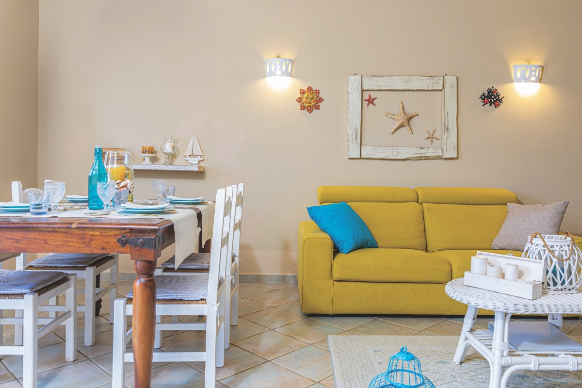 The holiday home welcomes guests with a refreshing palette inspired by the crystal-clear waters of Sardinia. The apartment has a bright living room with a sofa, dining area and access to the terrace. The well-appointed kitchen features essential appliances, including a coffee machine, electric kettle, microwave, oven, and full cooking facilities.