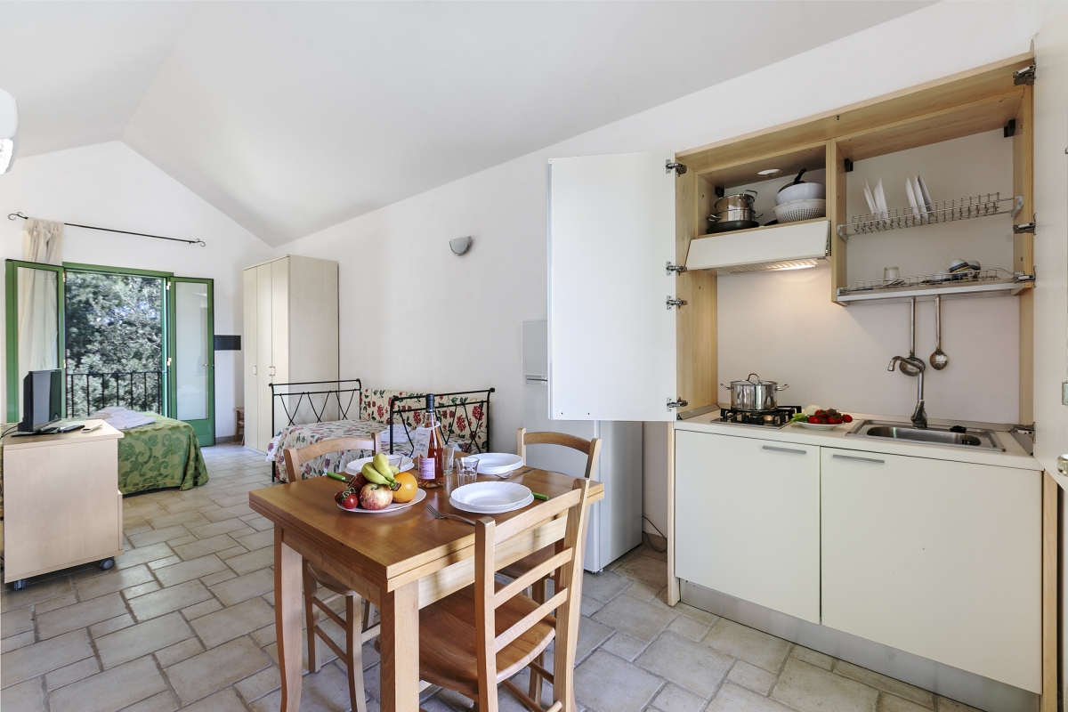 Inside, the open-plan living area is light and airy, furnished with a sofa bed, a flat-screen TV, a dining table for four, and a well-equipped kitchenette with a cooker hob, a Moka coffee pot, and a fridge with freezer.