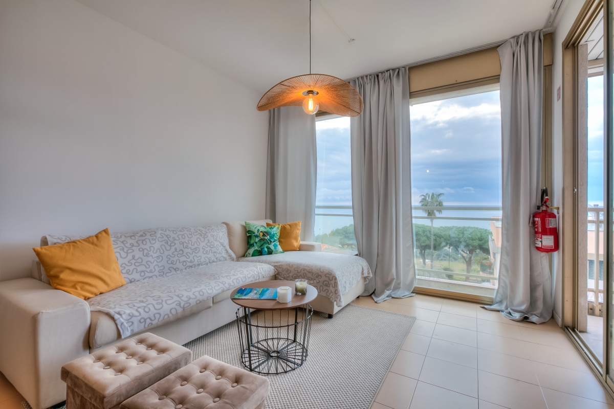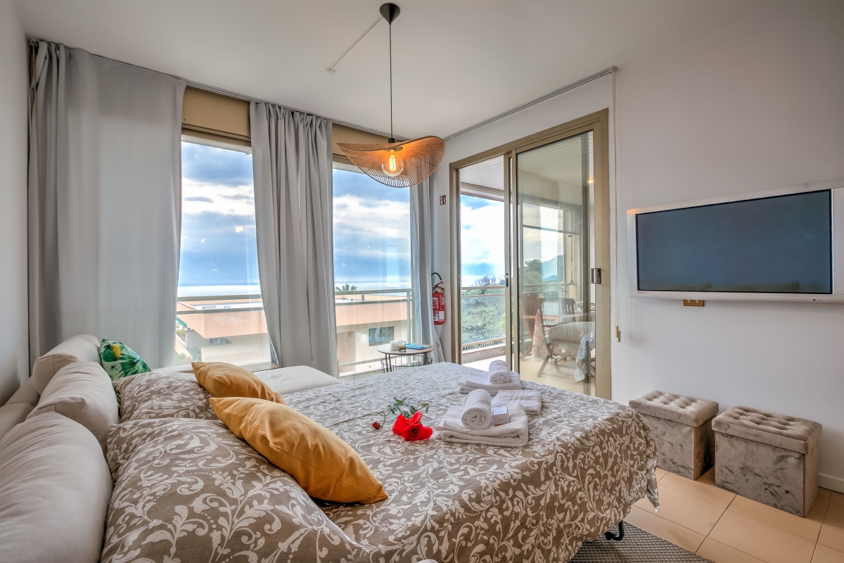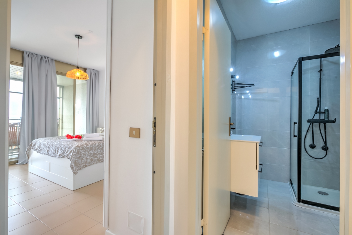 This second-floor apartment (with lift) offers and open-plan living area, furnished with a contemporary L-shaped sofa and a dining table. Large windows give a panoramic view of the sea. The kitchen is off the dining area and well-equipped with a cooker hob, microwave, dishwasher, Nespresso coffee machine and fridge/freezer.