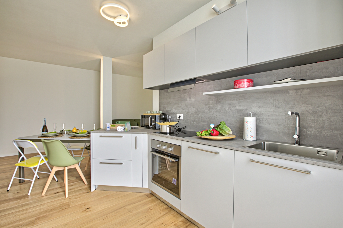 Step into a bright and spacious living area with air conditioning, where you’ll find a comfortable double sofa bed and a Smart TV ready for your favourite streaming platforms. The open-plan kitchen and dining space is fully equipped for all your needs, including a fridge, freezer, induction cooker, dishwasher, oven, microwave, and a Nescafé Dolce Gusto coffee machine. Enjoy your meals at the table or unwind with a drink on the private balcony.