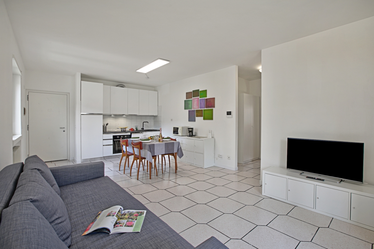 Inside, the bright open-plan living space is furnished with a comfortable sofa bed, a Smart flatscreen TV and a dining table. This area also incorporates a small kitchen equipped with; a Moka coffee machine, an induction hob, an oven, a microwave, a dishwasher and a fridge freezer.