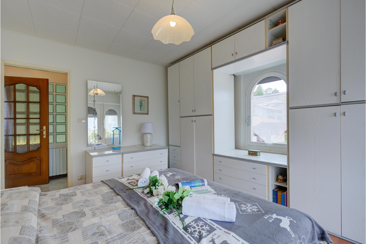 Offering a serene escape just a 7-minute drive from Stresa's lakeside promenade, the property enjoys a gorgeous open-plan living space with several large picture windows and views of the lake and mountains. This space is furnished with a dining table, a double sofa bed and a Smart flatscreen TV. The separate kitchen is equipped with a Mokka coffee machine, a cooker hob, an oven and a fridge freezer.