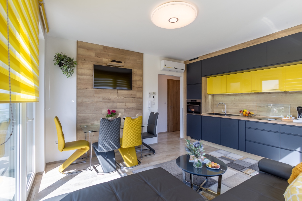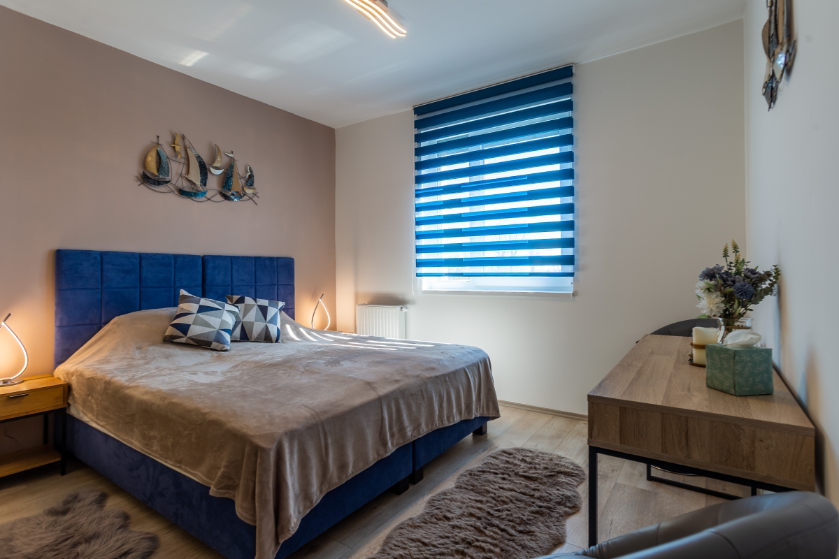 Inside, the apartment features a bright living room that opens onto a spacious balcony with an outdoor dining area, ideal for sipping coffee or enjoying sunset dinners with stunning lake views. The modern kitchen is fully equipped with an induction hob, electric kettle, microwave, dishwasher, oven, toaster, and fridge with freezer, making it convenient for longer stays. Whether for a romantic retreat or a family escape, this home offers a luxurious lakeside experience.