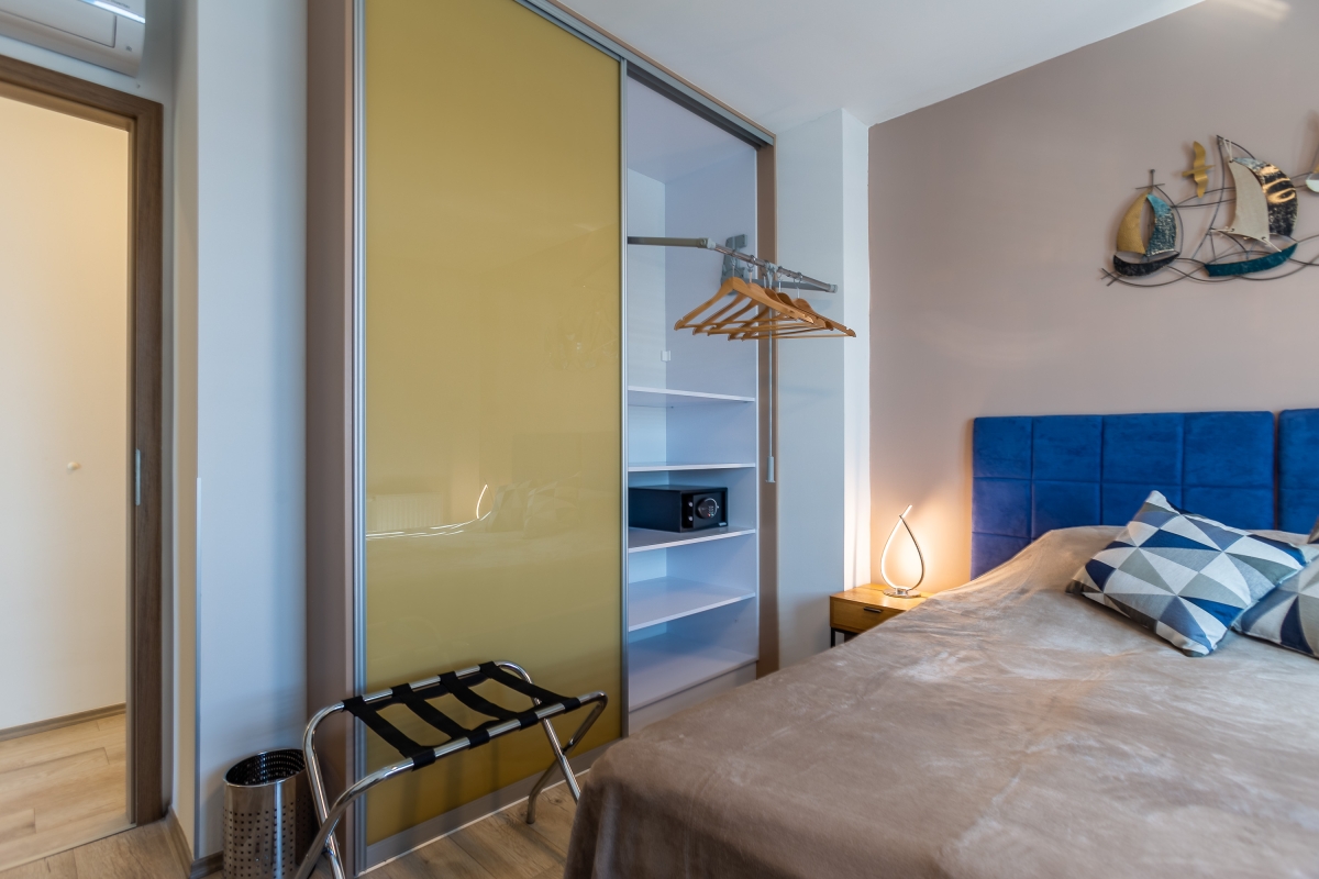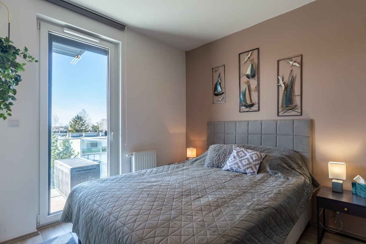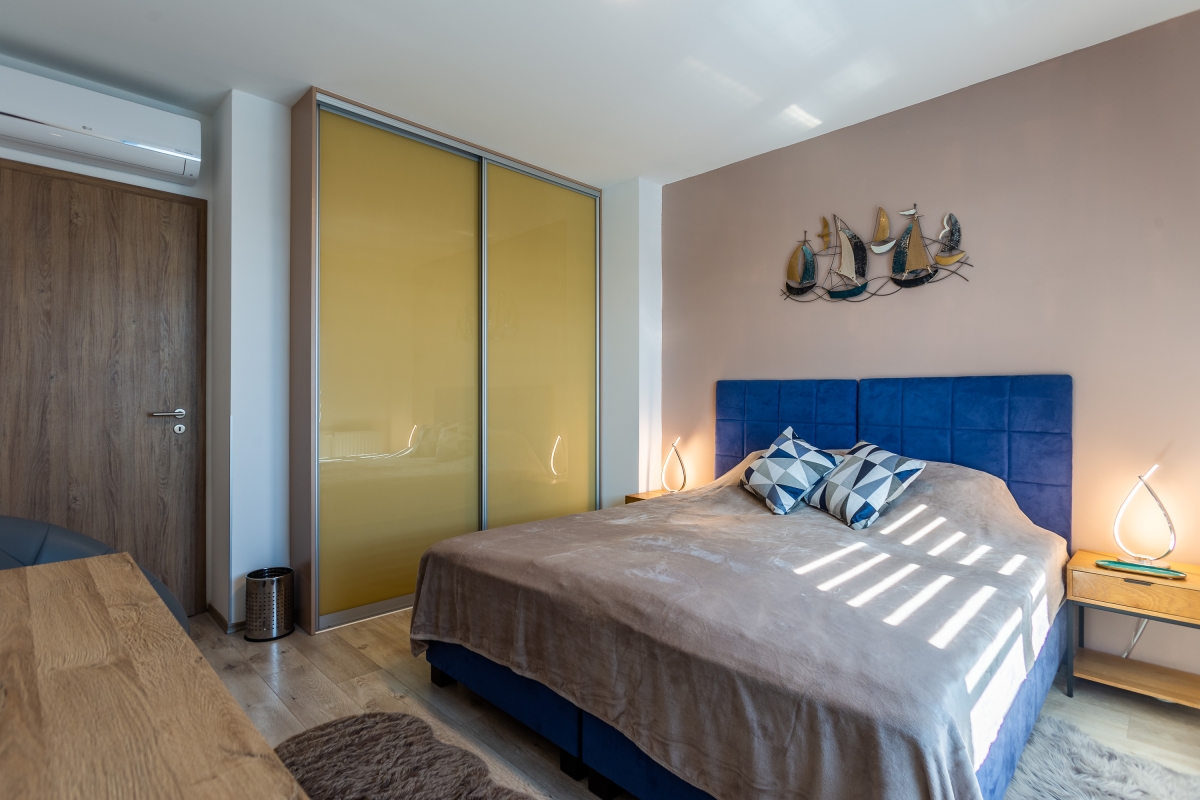 Bedroom 2: This bedroom has a large double bed and a wardrobe. It also has access to the balcony.