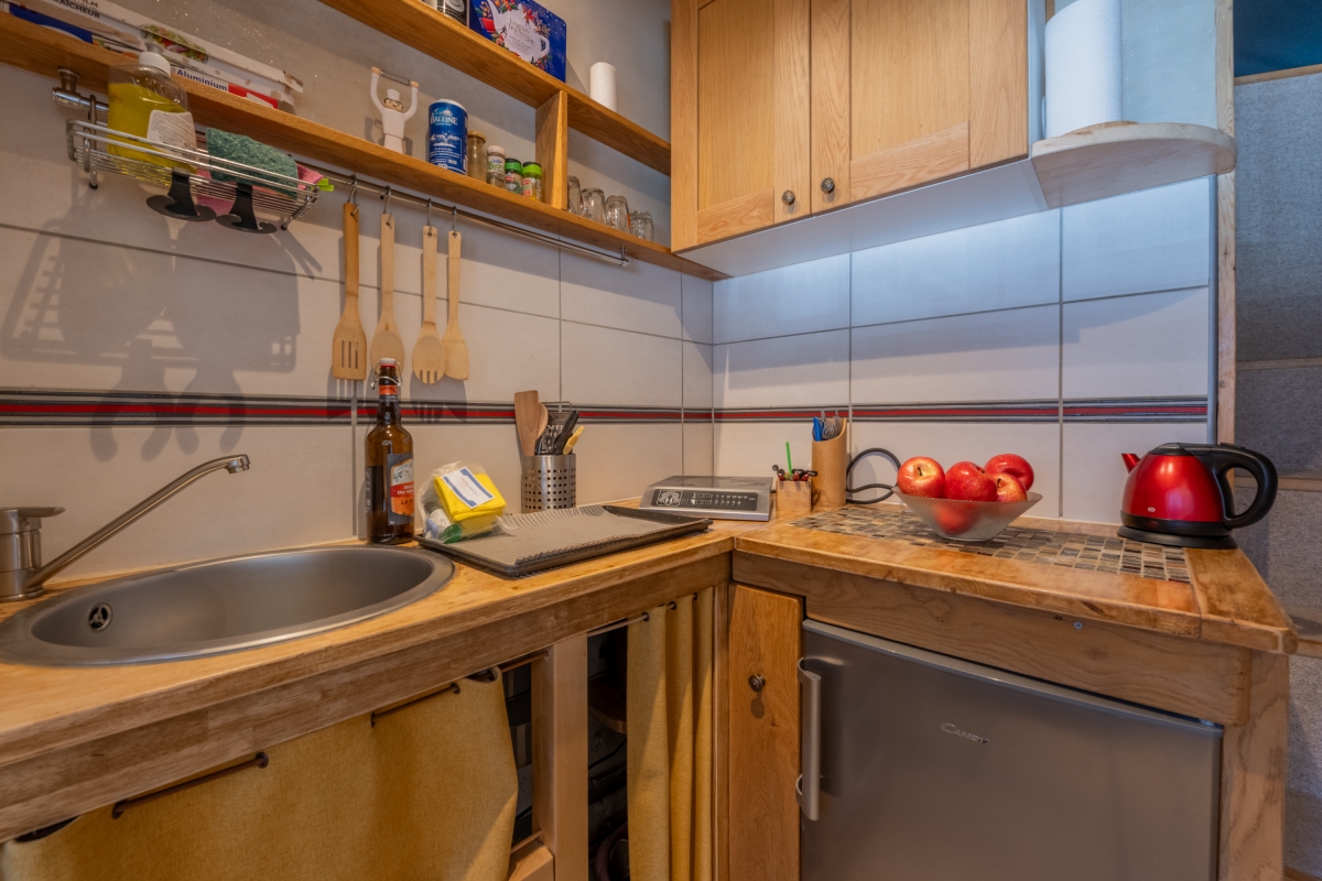 Ancolies Studio is a modern apartment, perfect for two guests. It features a comfortable open-plan living space with no separate bedroom. Located on the third floor, the studio includes a cozy sleeping area with a double bed—ideal for relaxing after a day of adventure. The open kitchenette is well-equipped with an electric kettle, oven, refrigerator, and induction cooktop, making it easy to prepare meals. The apartment also includes electric radiators for heating.