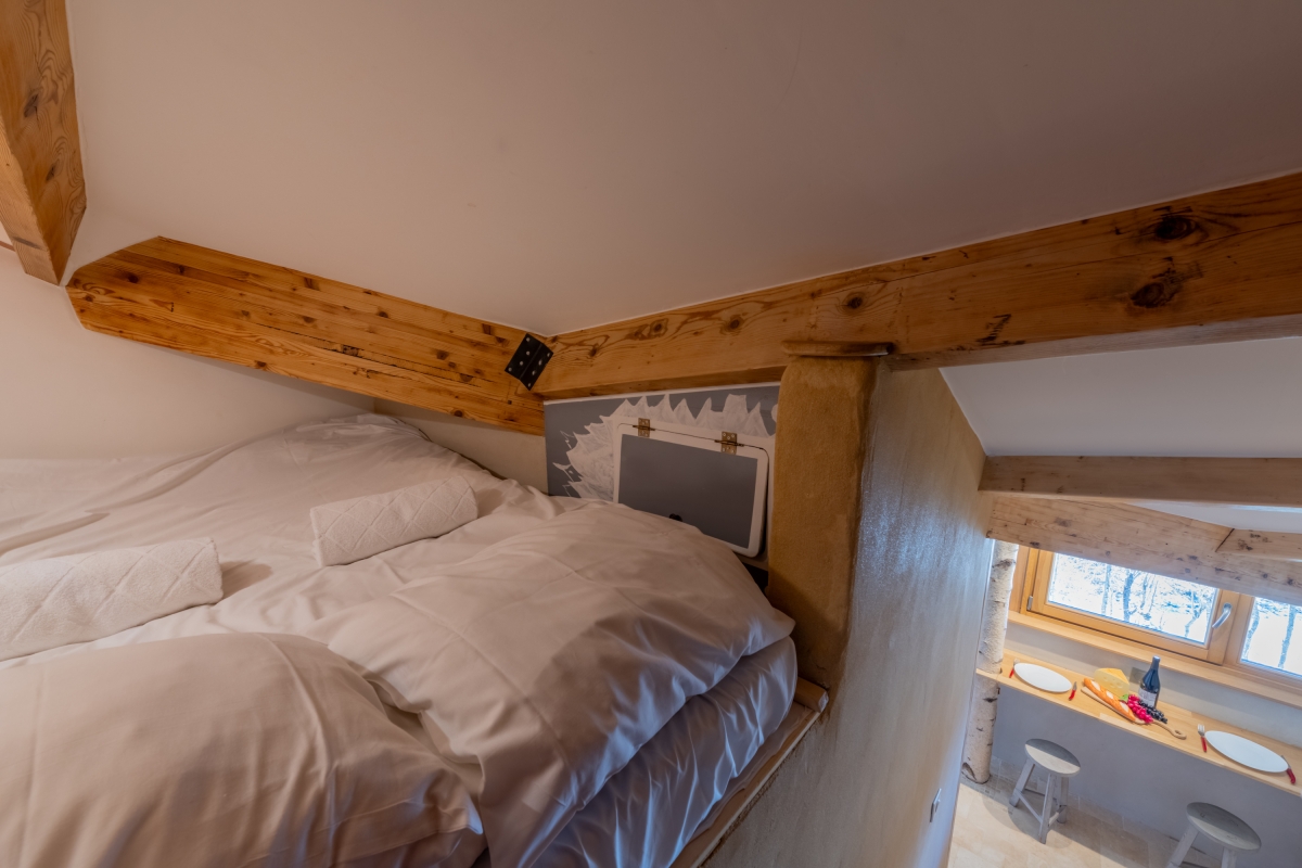 The living area includes a comfortable double bed, providing a cozy space to rest.
