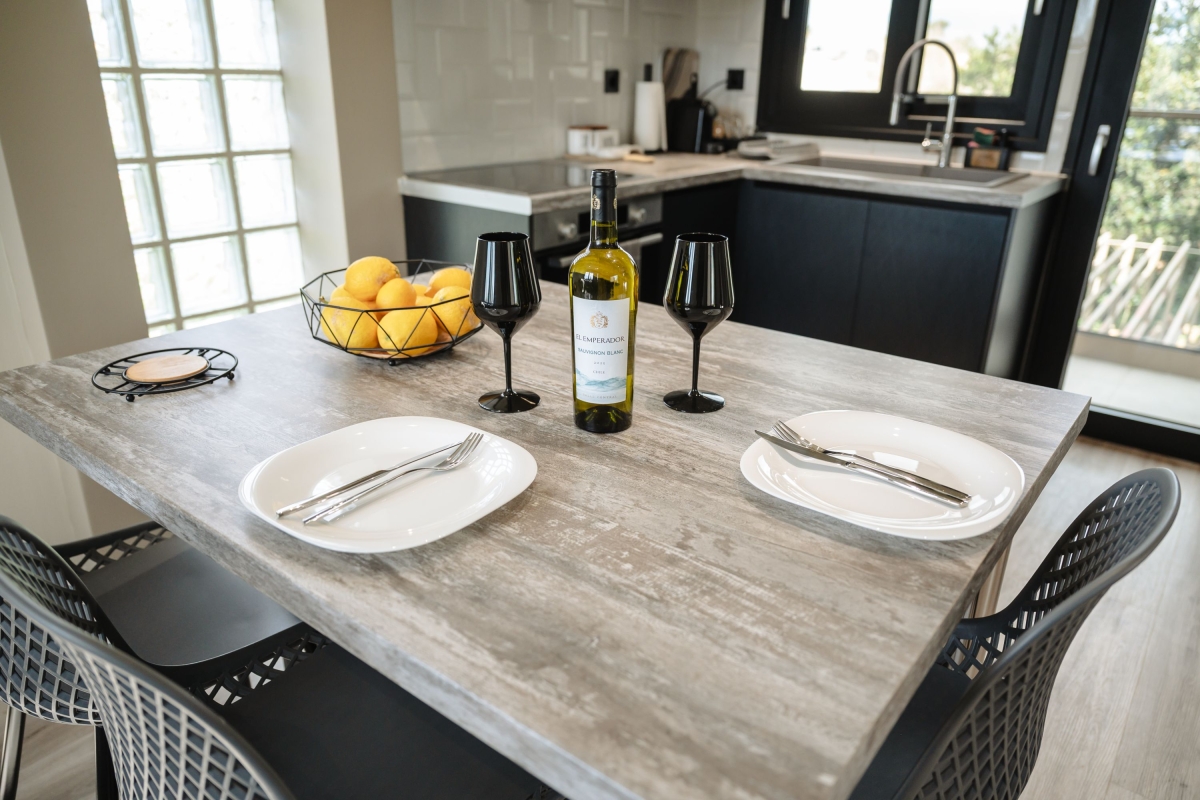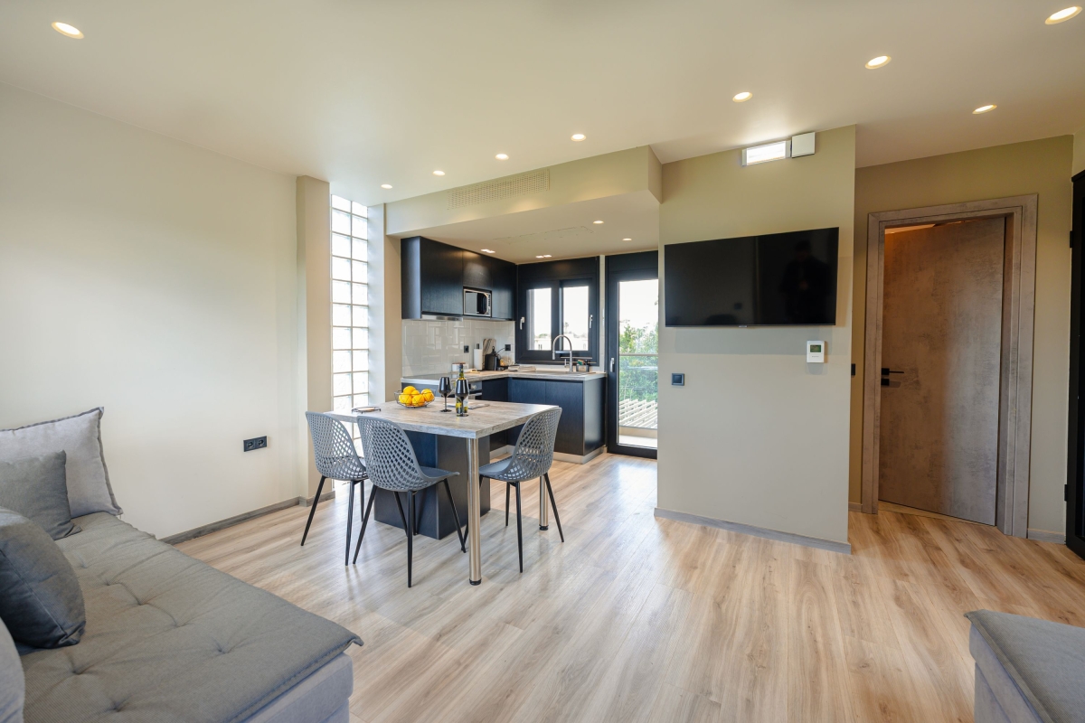 Set within a 300 sq. m. estate, Grand Kourouta features four exclusive apartments with a shared pool and a jacuzzi. The complex’s industrial-inspired aesthetic is paired with warm textures, soft tones, and custom furnishings that enhance the minimalist yet welcoming atmosphere.