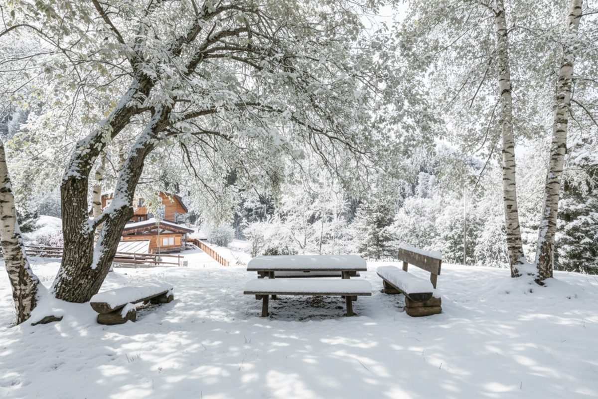 The residence has a lovely, shared, garden with mature trees and picnic tables where guests can enjoy meals in the fresh mountain air.