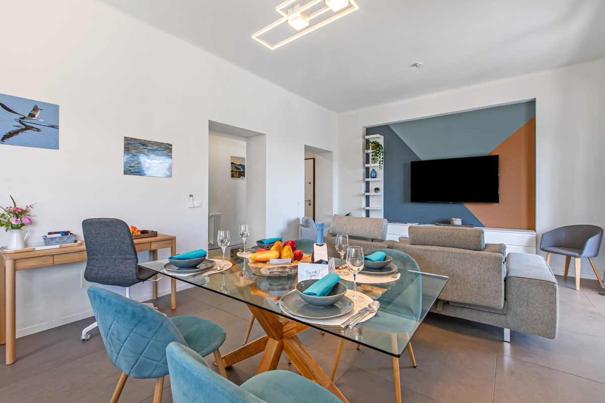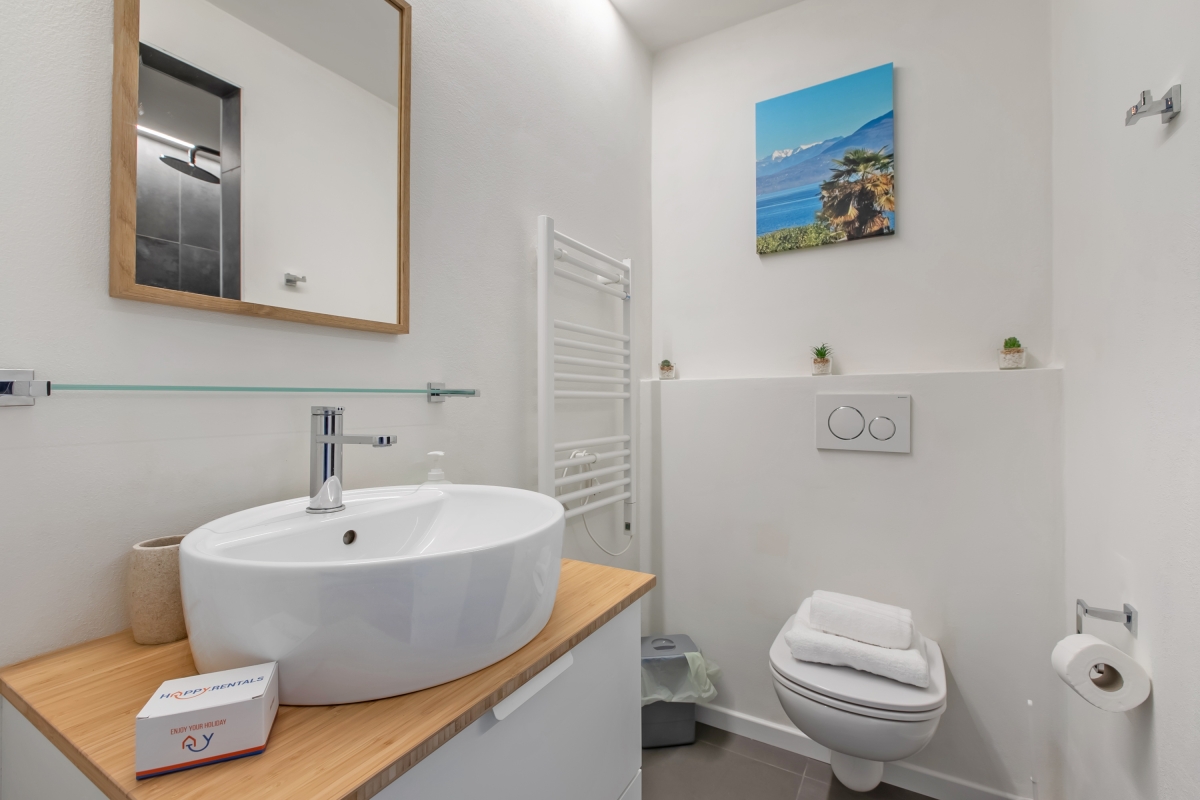 Inside, the open kitchen-diner is fully equipped with an induction hob, oven, electric kettle, and dishwasher, ideal for preparing meals. The bright living room features a terrace where you can enjoy the beautiful lake view. Modern amenities include free Wi-Fi and a Smart TV.