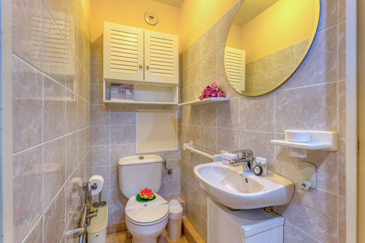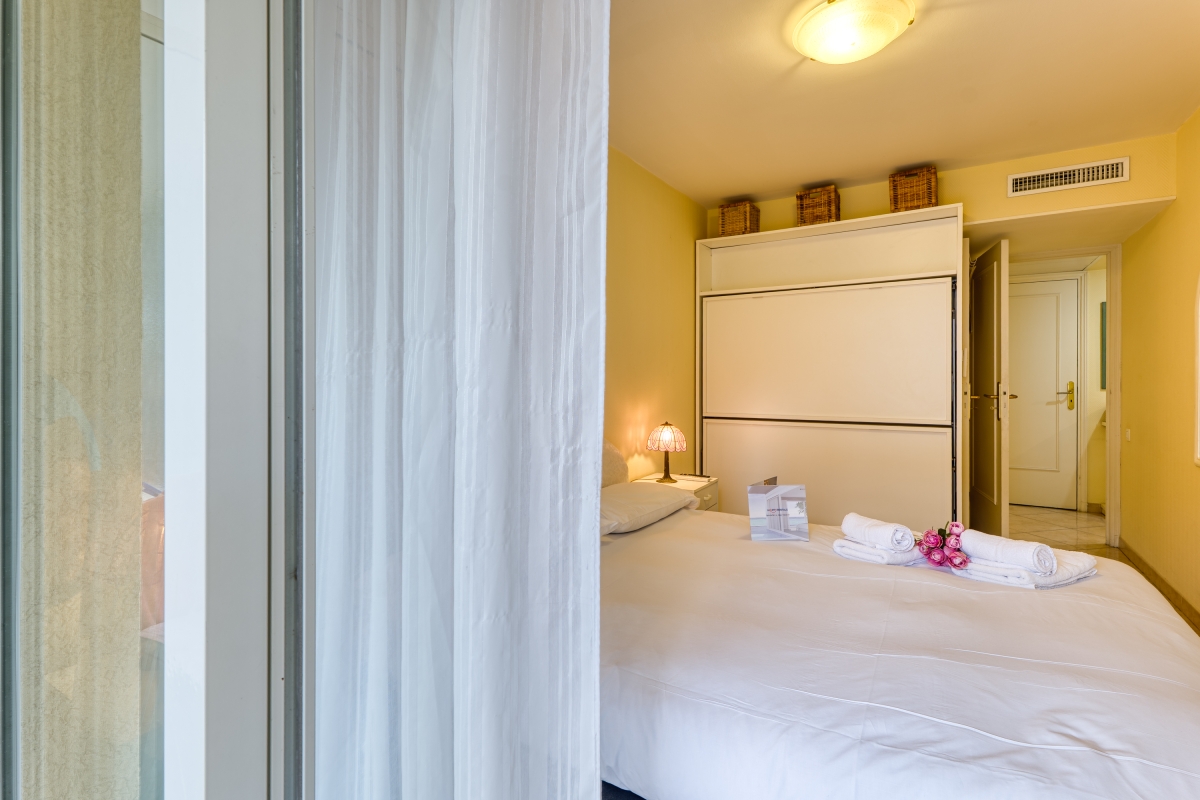 This one-bedroom apartment has an airy sitting/dining room, which is furnished with two sofas, a charming dresser and a table with chairs. A glass door leads out to the private balcony which acts as an outdoor dining area, with a table for up to 6 people. Double doors lead from the balcony into the adjacent kitchen. The kitchen is well-appointed with a cooker hob, oven, microwave and fridge/freezer. It also has a small dining table for 2 for quick snacks.