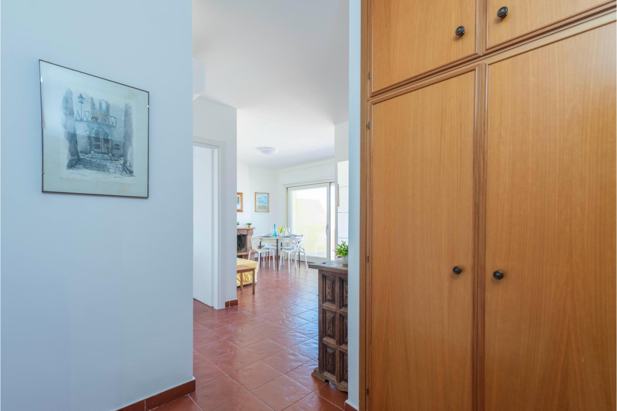 The apartment is cool and breezy thanks to the terracotta tiled floors and the large glass doors that open onto the terrace, letting in the sea breeze. The main living space is furnished with a sofa, an open fireplace and a dining table. There is a second dining table out on the terrace for meals al fresco. The separate kitchen is fitted with a cooker hob, microwave, Moka coffee maker, kettle, toaster and fridge/freezer.