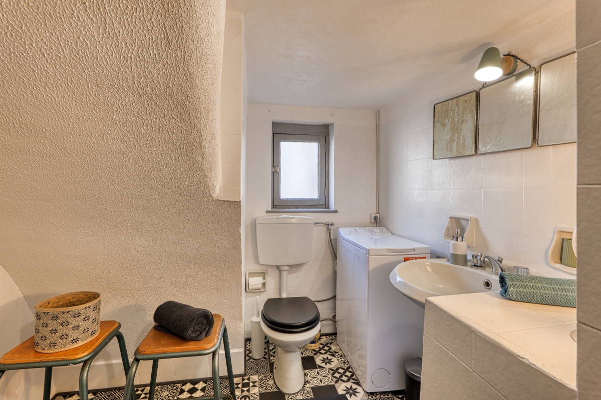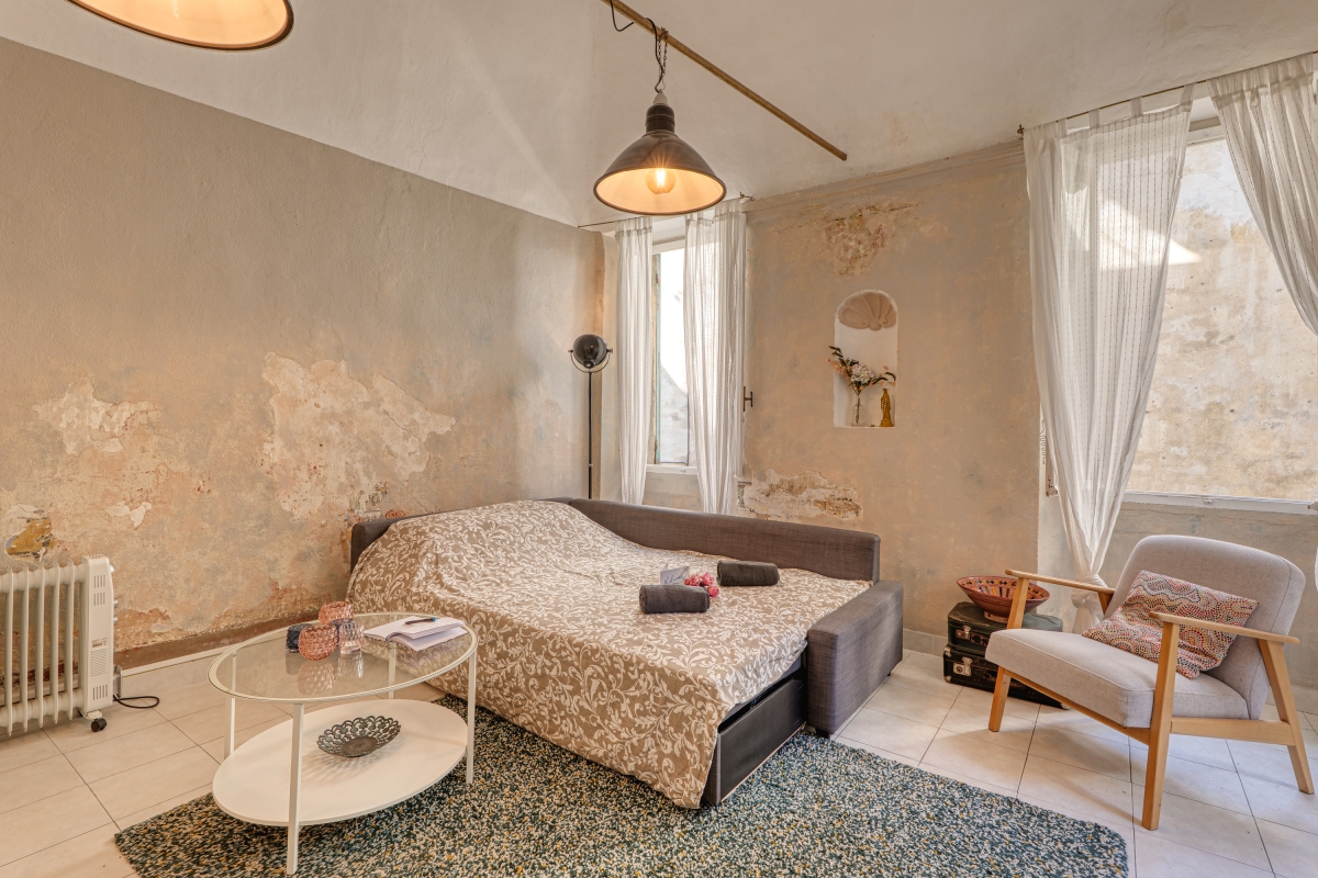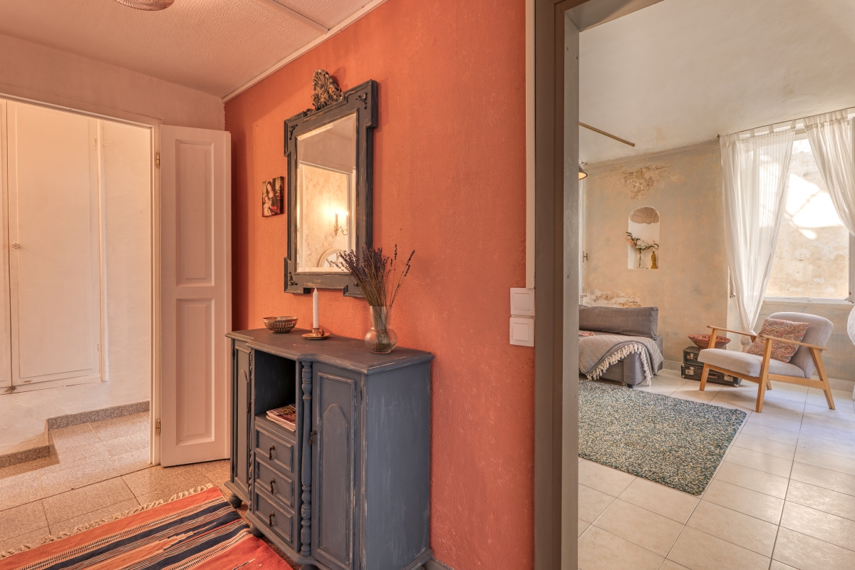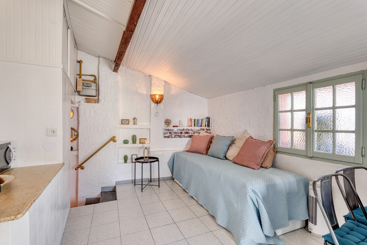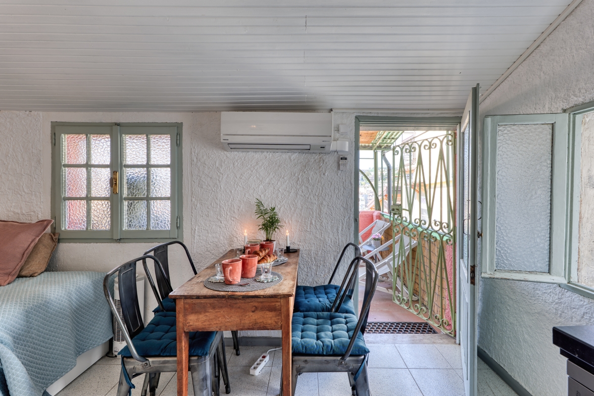 This authentic retreat has been recently renovated, respecting the original architecture, and offers a spacious living room furnished with a double sofa bed, a wardrobe, and a flat-screen TV. The separate, air-conditioned kitchen/dining room also features a single sofa bed with a pull-out single bed and opens onto the terrace. The kitchen is equipped with a Nespresso coffee machine, an induction stove, a microwave, and a dishwasher.