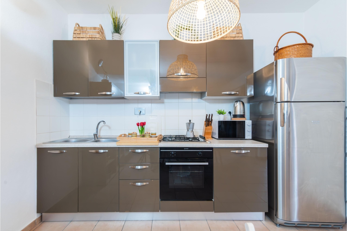 The contemporary interior features a spacious open plan living room furnished with a comfortable double sofa bed, a dining table, a flatscreen Smart TV and a well-stocked library of books and games. This area also incorporates the kitchen, which is fitted with: a Moka coffee machine, an induction hob, an oven, a microwave and an American fridge freezer.